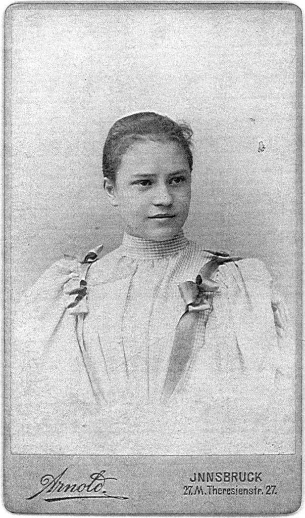 Ich vermute, dass dieses Foto der ganz jungen Eleonore während ihres Schulaufenthaltes bei den Ursulinen in Innsbruck in den letzten Jahren vor der Jahrhundertwende gemacht wurde. Da dürfte sie ungefähr 13 Jahre alt gewesen sein.
