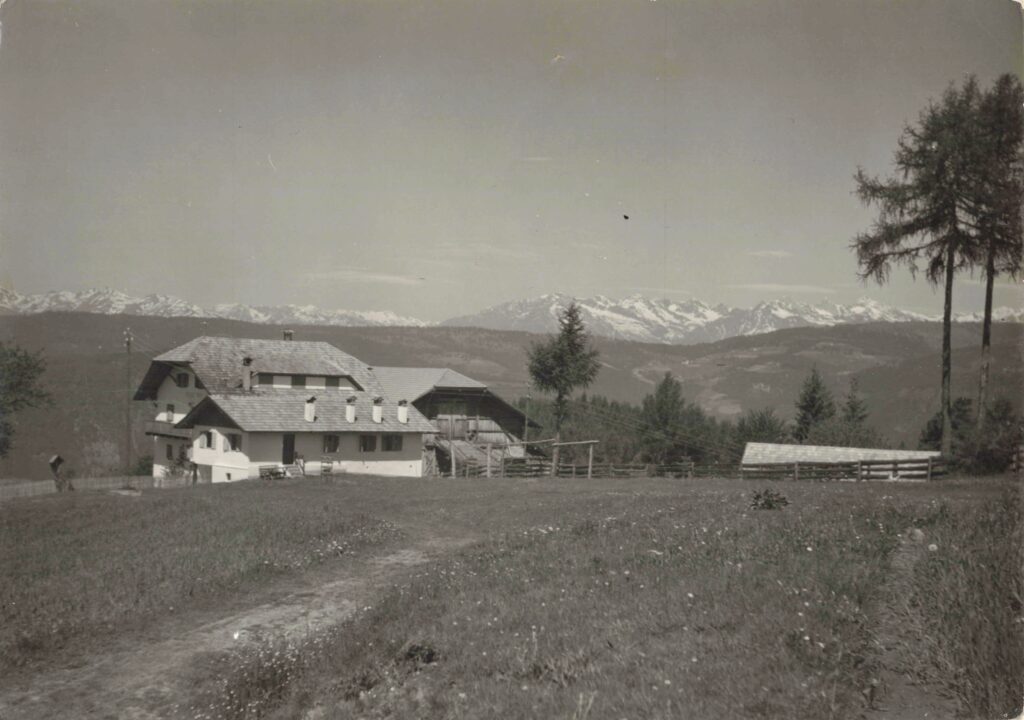 Das Foto der obigen Ansichtskarte wurde gegen Nordwesten aufgenommen. Ganz im Hintergrund kann man die schneebedeckten Ötztaler Alpen erkennen, weiter vorne der Bergrücken des Saltens und in der vordersten Ebene steht der Miglerhof, eigentlich, um genauer zu sein, der Obermigler. Das Wohnhaus weist ein schindelgedecktes Walmdach auf, eine Dachform, die auf dem Ritten früher bei den Wohngebäuden der Höfe sehr häufig anzutreffen war.