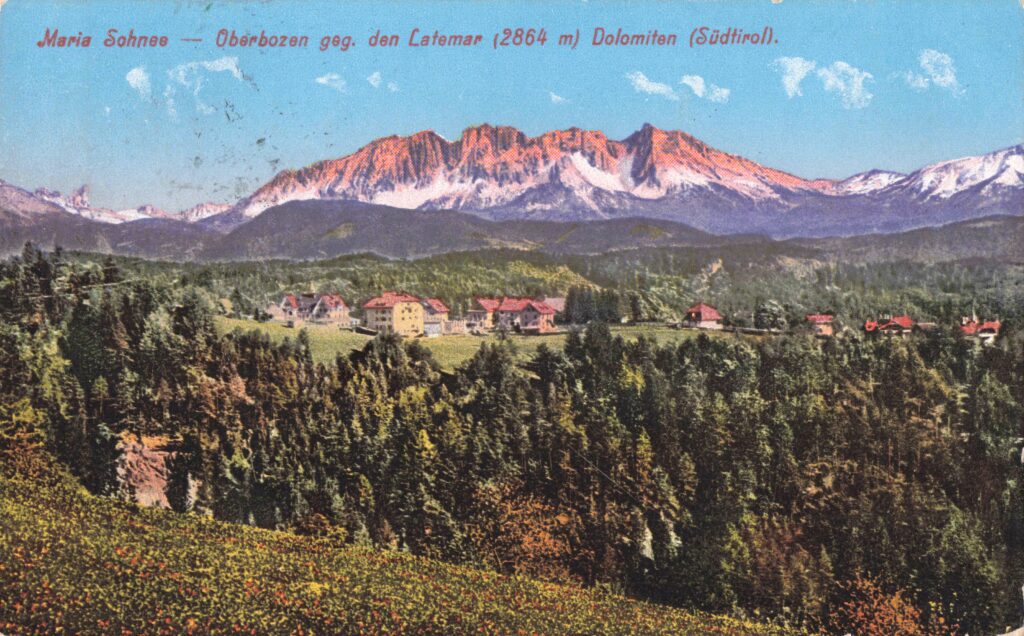 Abb 2: “Maria Schnee – Oberbozen geg. den Latemar (2864 m). Dolomiten (Südtirol).” (Kolorierte Ansichtskarte, Anfang 20. Jahrhundert).