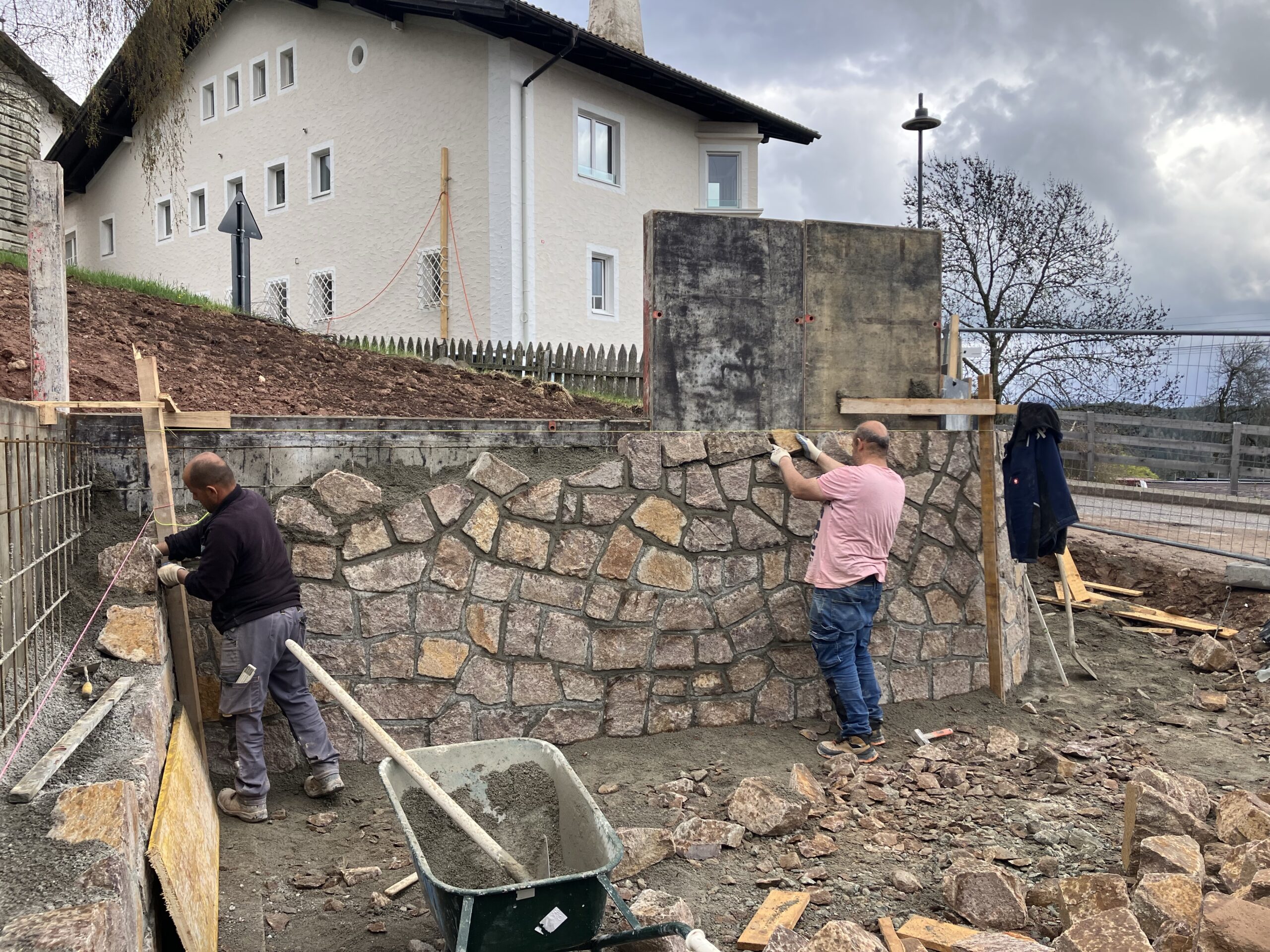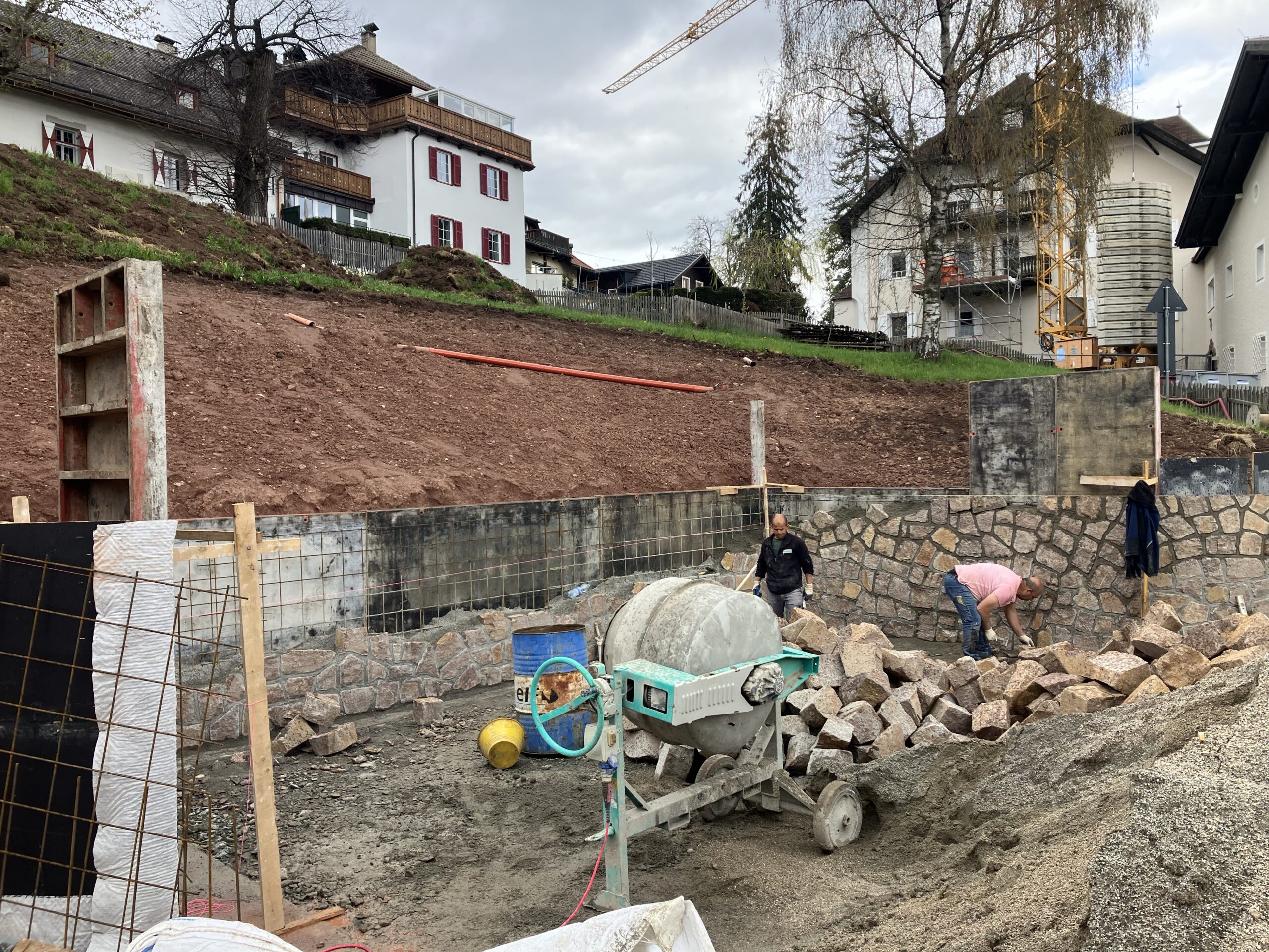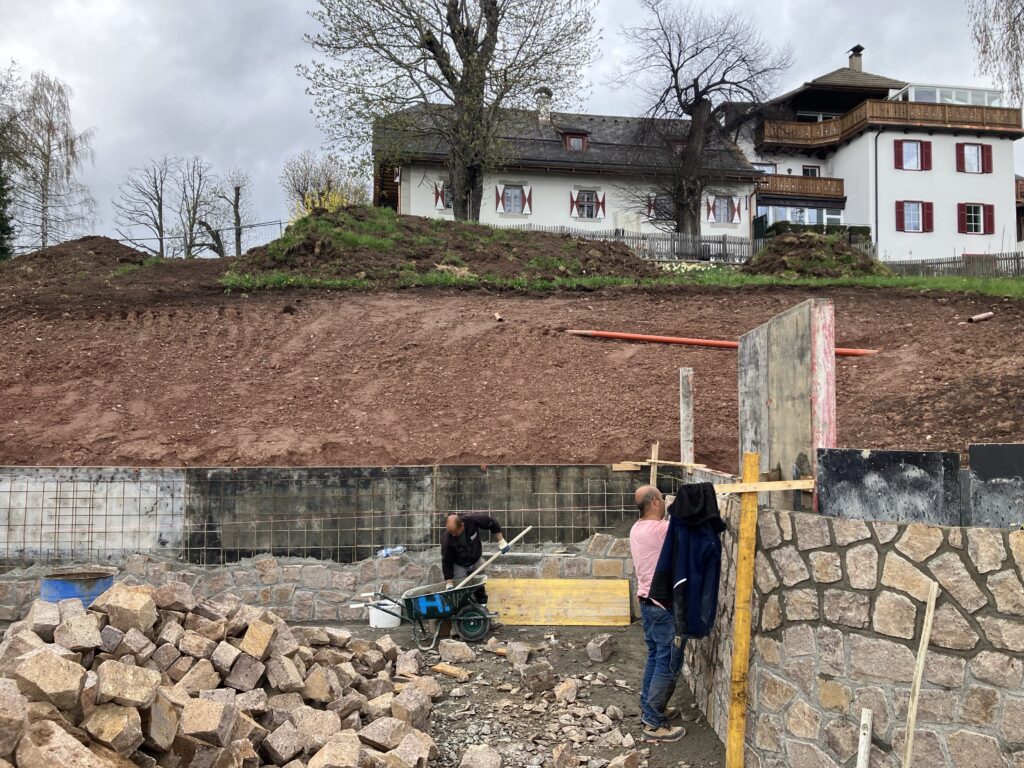 Diese Arbeiten erfolgen in Zusammenarbeit mit dem Nachbarn Erwin Mayr, der im vergangenen Herbst das alte Hotel Viktoria, einst das Wohngebäude des Doppelbauern, abgerissen hat und jetzt mit sehr ähnlichen Formen und Abmessungen wiedererrichten lässt. In diesen Tagen sollten die Natursteinmauern der Parkplatzbucht errichtet werden, danach folgt der eigentliche Bau des Anfahrtsweges, hinauf zur oberen Wiese.