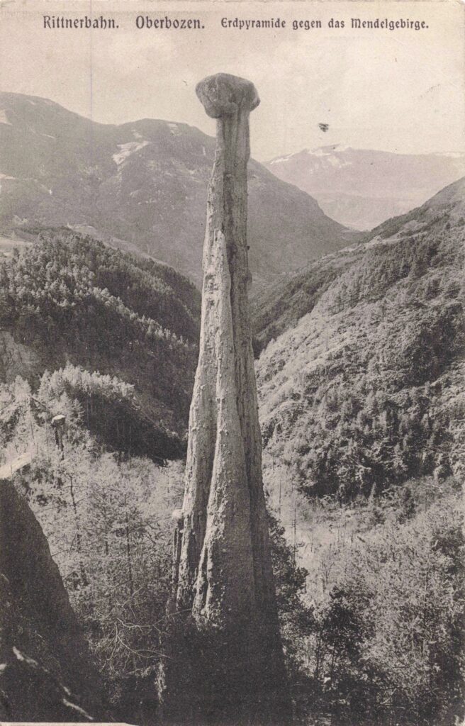 Abb. 1: „Rittnerbahn. Oberbozen. Erdpyramide gegen das Mendelgebirge.“ (Ansichtskarte, Anfang 20. Jh.). Das Klicken auf die Abbildung vergrößert wie immer deren Darstellung am Bildschirm. Unter den Erdpyramiden die Rivelaunschlucht., im Hintergrund links der Kohlererberg, ganz hinten der Mendelzug mit dem verschneiten Roen.