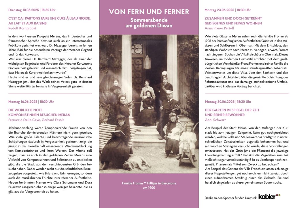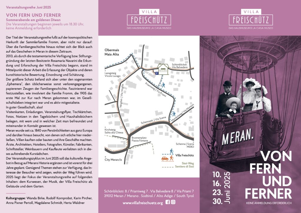 Das Hausmuseum Villa Freischütz in Meran musste meine Neugierde wecken. Wenn man sich, wie ich, mit dem Auf und Ab der Villa Kinsele und der involvierten Familien sowie den Veränderungen der Umgebung auseinandersetzt, dann kommt man um einen Besuch der Villa Freischütz nicht herum!