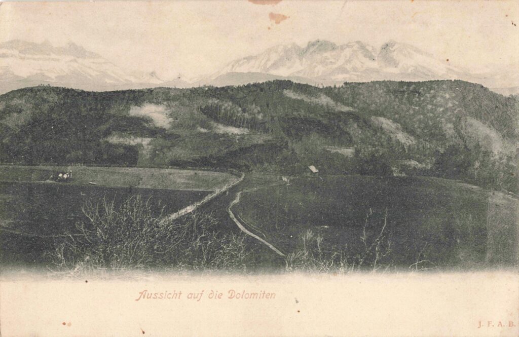 Abb. 1: „Aussicht auf die Dolomiten“, Ansichstskarte, um der vorletzten Jahrhundertwende.