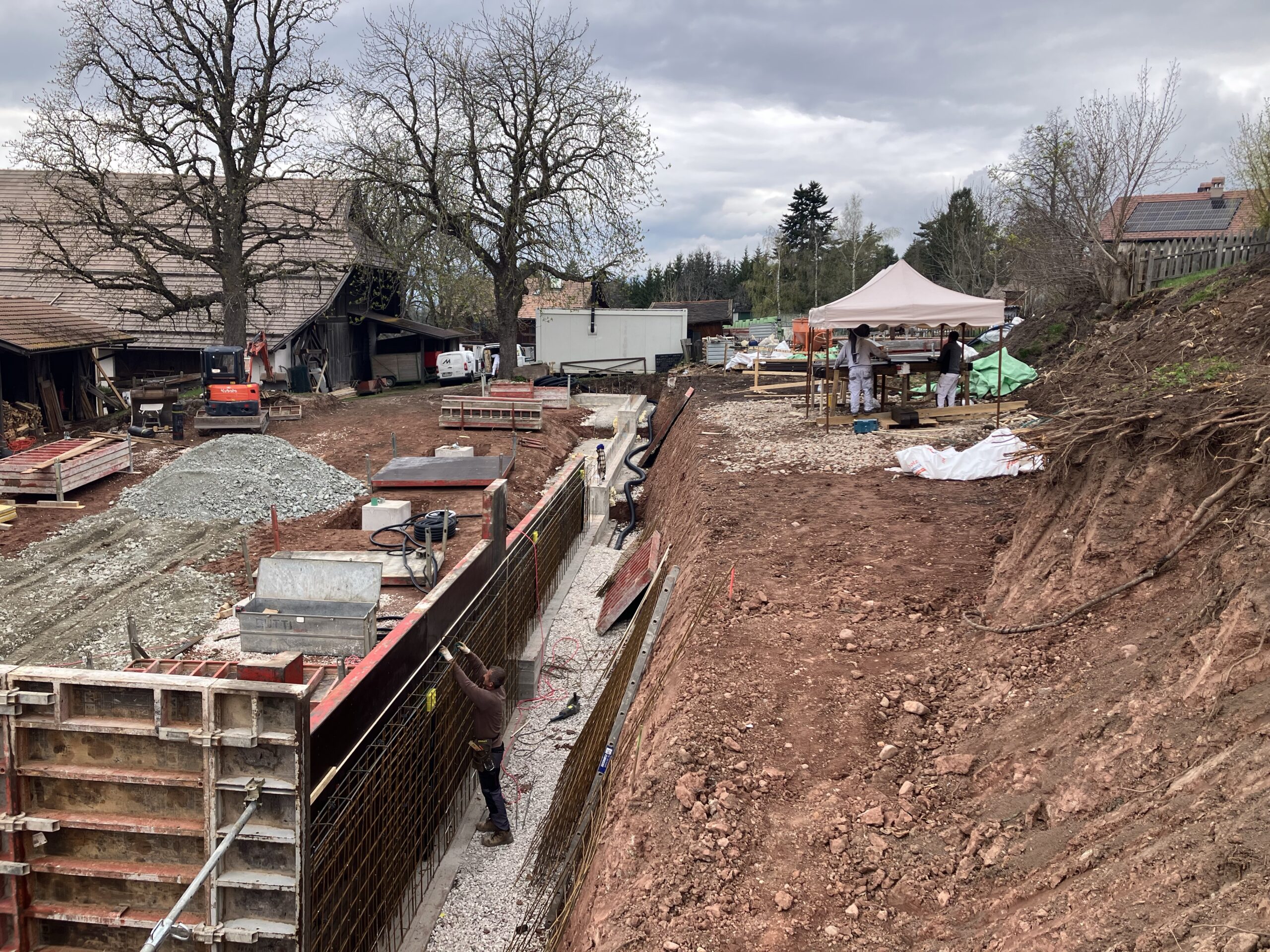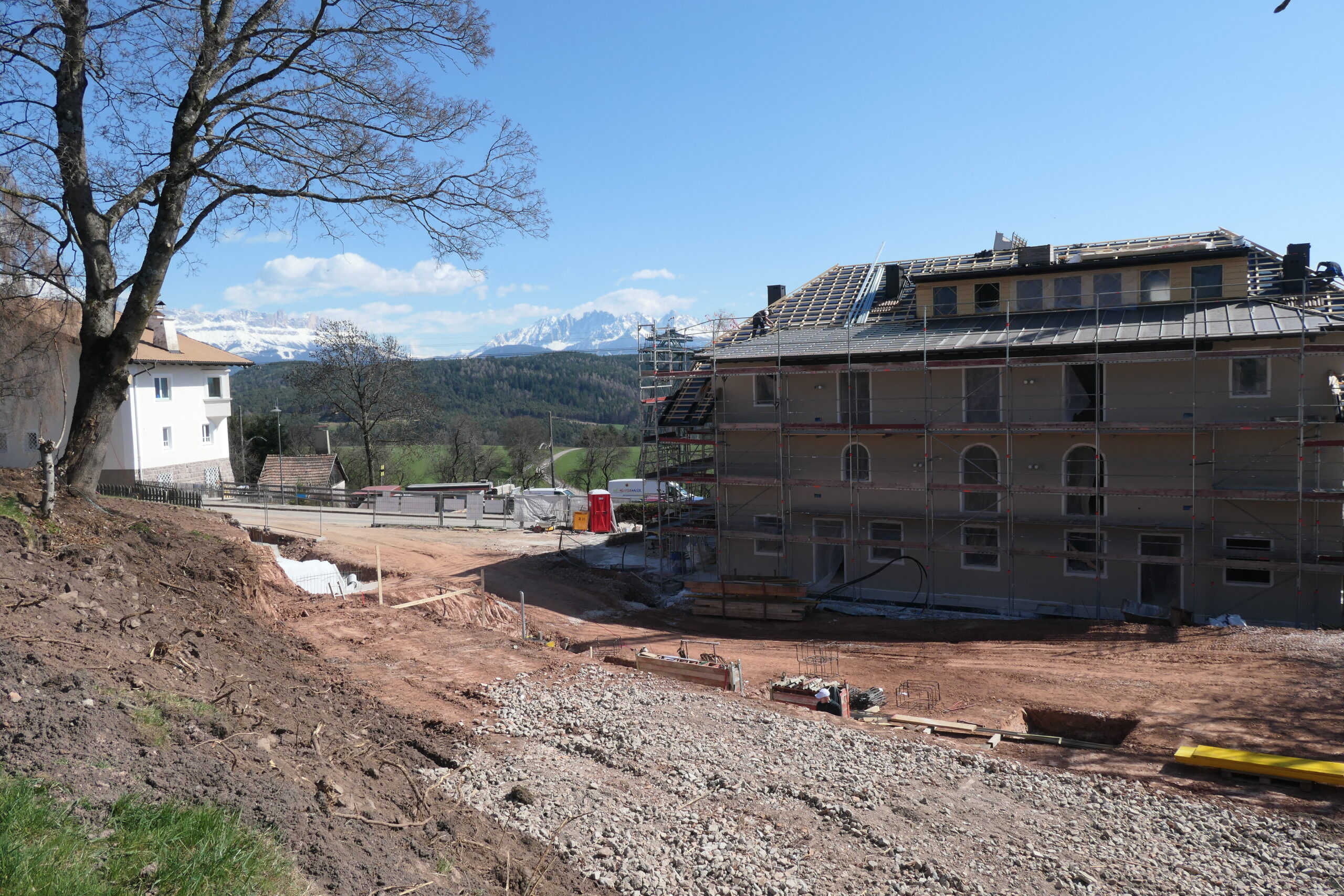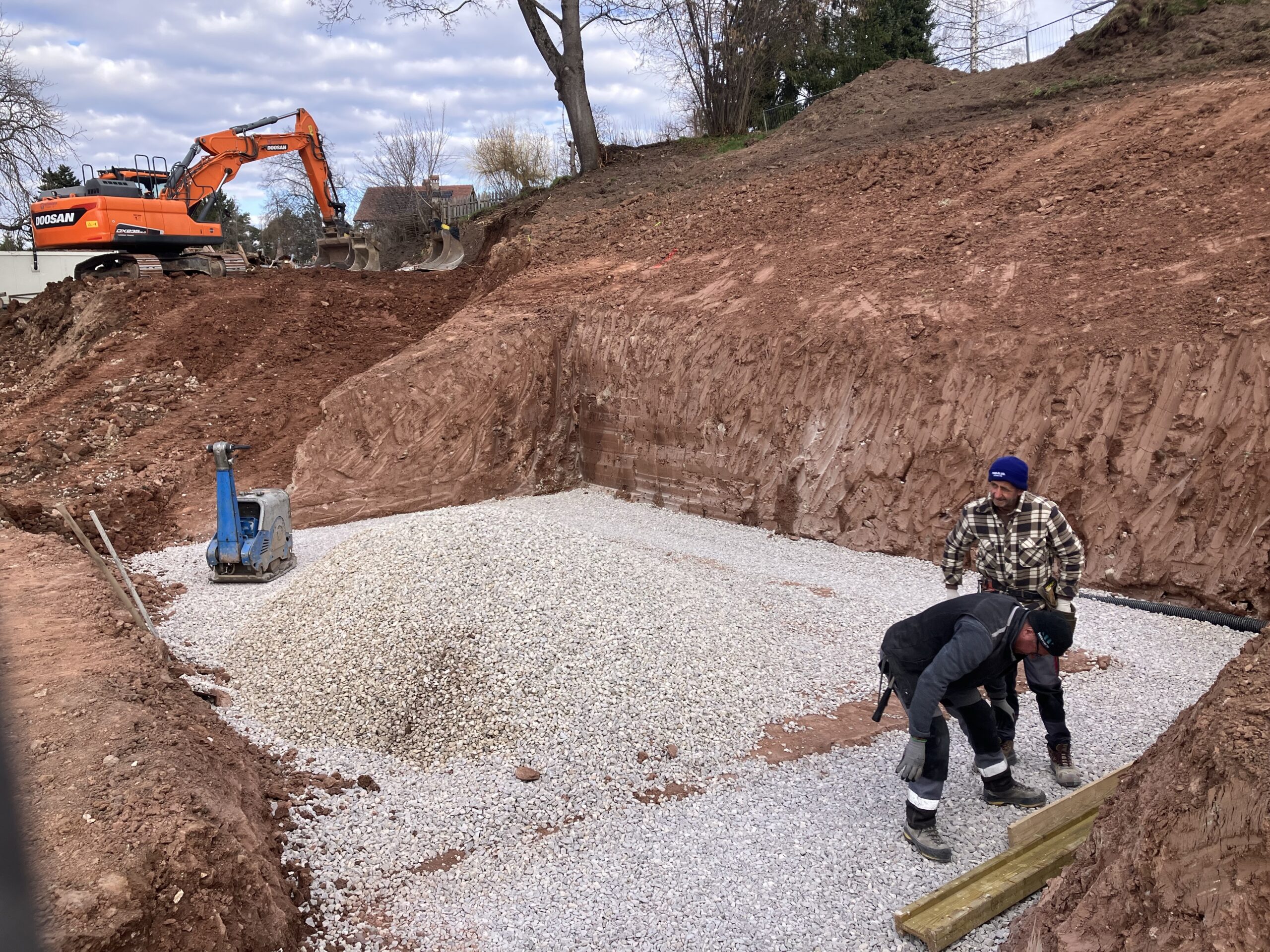 Mit dem Setzen der Bäume längs der zusätzlichen Einfahrt, welche im Rahmen von kleineren Grenzverschiebungen mit dem südlichen Nachbarn gebaut wurde (ich berichtete), kann auch dieses Vorhaben als beendet betrachtet werden. Es stimmt, der Bretterzaun muss wieder montiert und ergänzt werden und mittelfristig wäre es sinnvoll, auch ein Gitter am Beginn der Rampe montieren zu lassen. Aber momentan will ich weitere Ausgaben vermeiden und die Benutzbarkeit ist ja so auch gegeben.
