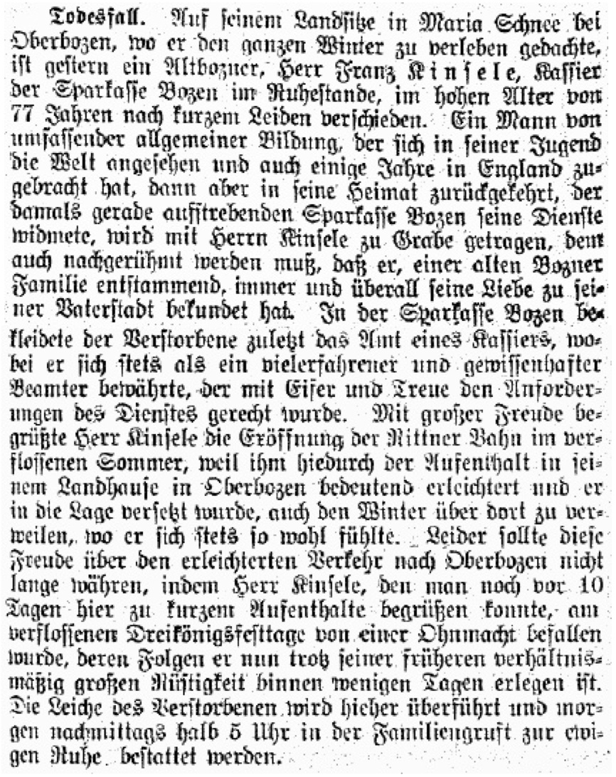 Leider konnte Franz Kinsele, der inzwischen pensionierte Sparkassenkassier, für nur allzu kurze Zeit die Anpassungen am Haus und – noch weniger – die gute Verbindung mit Bozen genießen. Die Inbetriebnahme der Zahnradbahn erfolgte nämlich im Sommer 1907, er verstarb aber überraschenderweise in Oberbozen am 9. Jänner 1908, im 76. Lebensjahre an Altersschwäche, wie angebeben wurde.