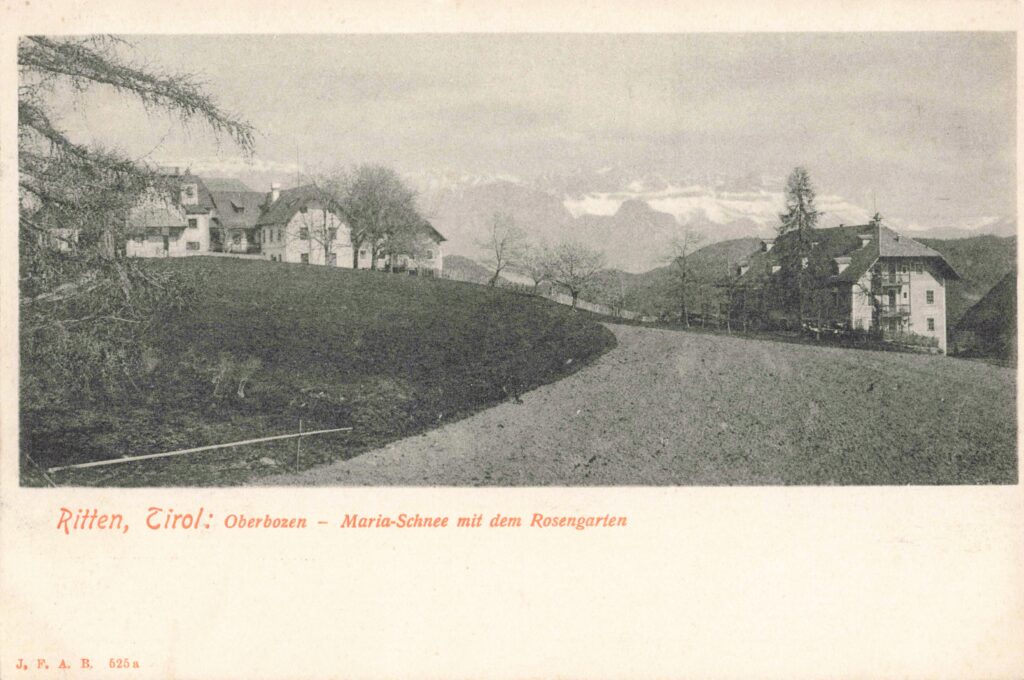 Eine sehr frühe Aufnahme, mindestens ein Jahrzehnt vor der Eröffnung der Rittnerbahn, als die Welt in Oberbozen laut obigen Autor noch in Ordnung war. Als Basis meiner Zeiteinschätzung dient die Beobachtung, dass unser Haus noch nicht den Außenkamin aufweist, der notwendig wurde, als Franz Kinsele Ende der 1890er Jahre einen Kachelofen in der hinteren Kammer einbauen ließ. Ein weiteres Indiz für die vortouristische Zeit ist das weitgehende Fehlen von Zäunen. Die mit dem Bahnbau einsetzende Parzellierung der Grundstücke für den Bau der Villen hat noch nicht stattgefunden, in Maria Schnee sind die Grundstücke noch fast ausschließlich landwirtschaftlich genutzt und auf den Unterhofer, den Oberhofer und dem Doppelbauer aufgeteilt. Auf der rechten Hälfte ist eine Acker sichtbar; im Mittelgebirge dominierte nämlich im Gegensatz zu heute der Getreideanbau, das Landschaftsbild war entsprechend vielfältiger. Vergrößert man das Bild, so erkennt man vor dem Kirchlein das große, noch frei stehende Wegkreuz und einen Weg, den Beginn des heutigen Sommerfrischweges Richtung St. Magdalena und Maria Himmelfahrt.