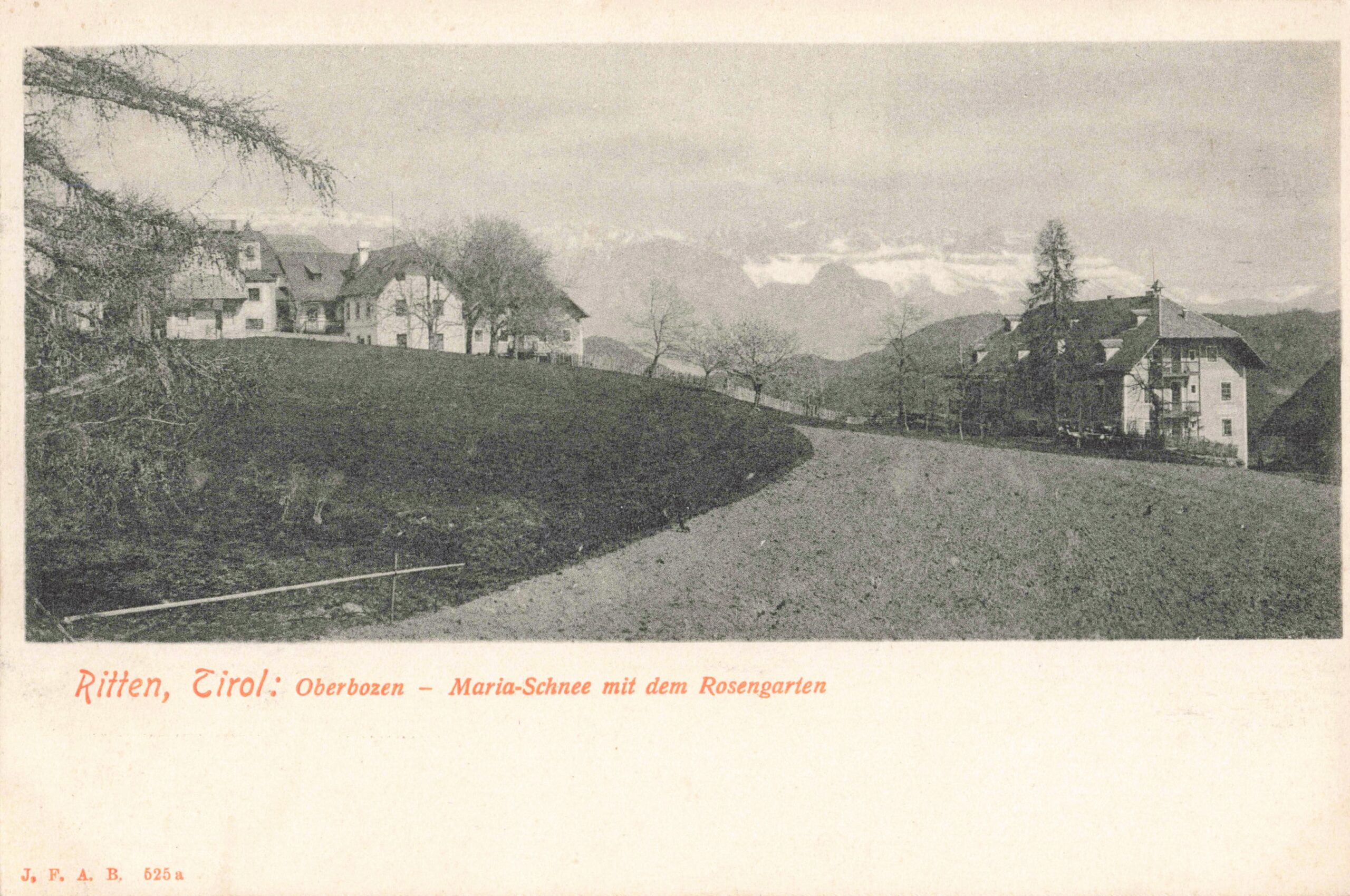 Abb 1: „Ritten, Tirol: Oberbozen – Maria Schnee mit dem Rosengarten“, Ansichtskarte, Anfang 20. Jahrhundert.