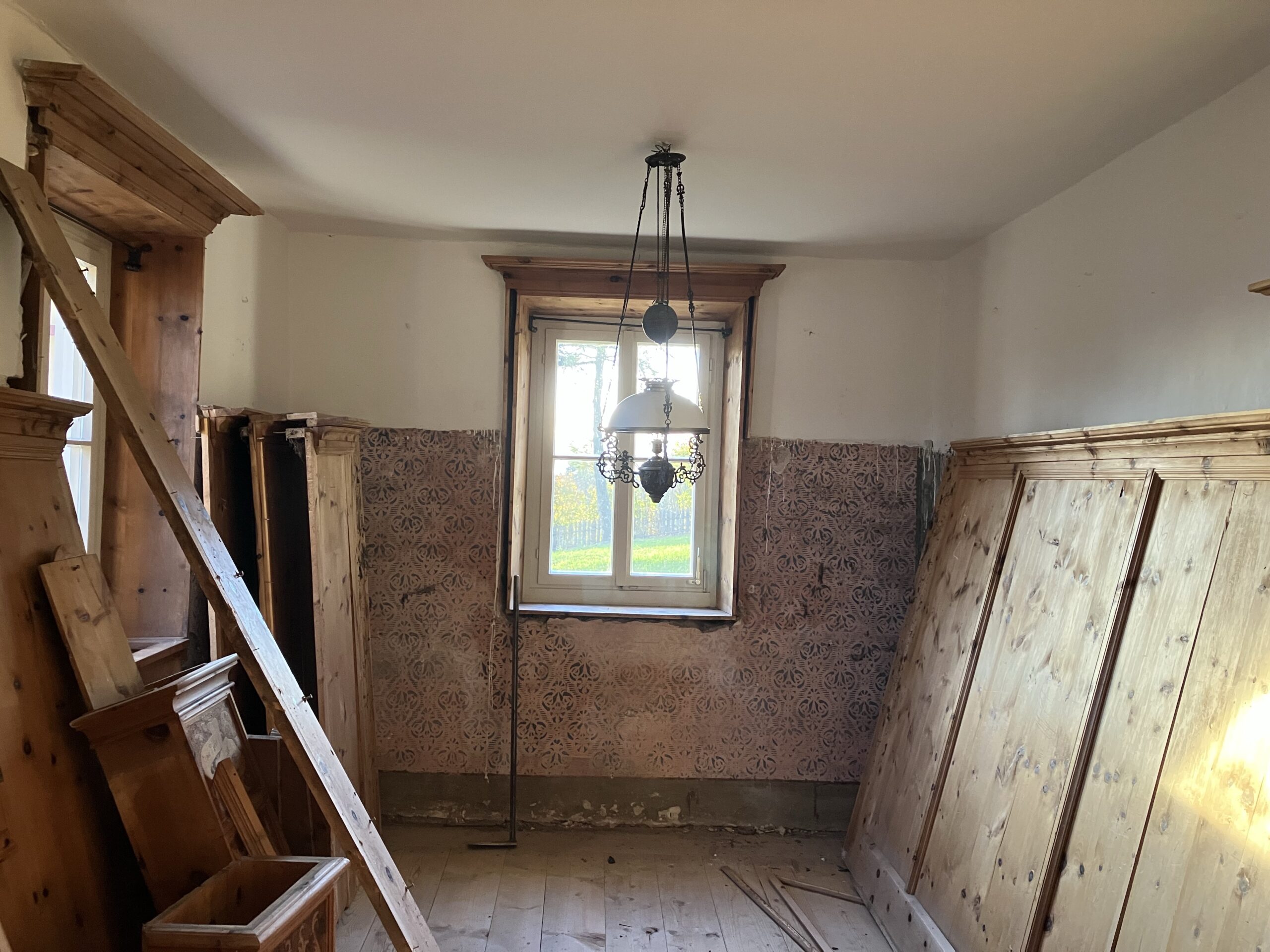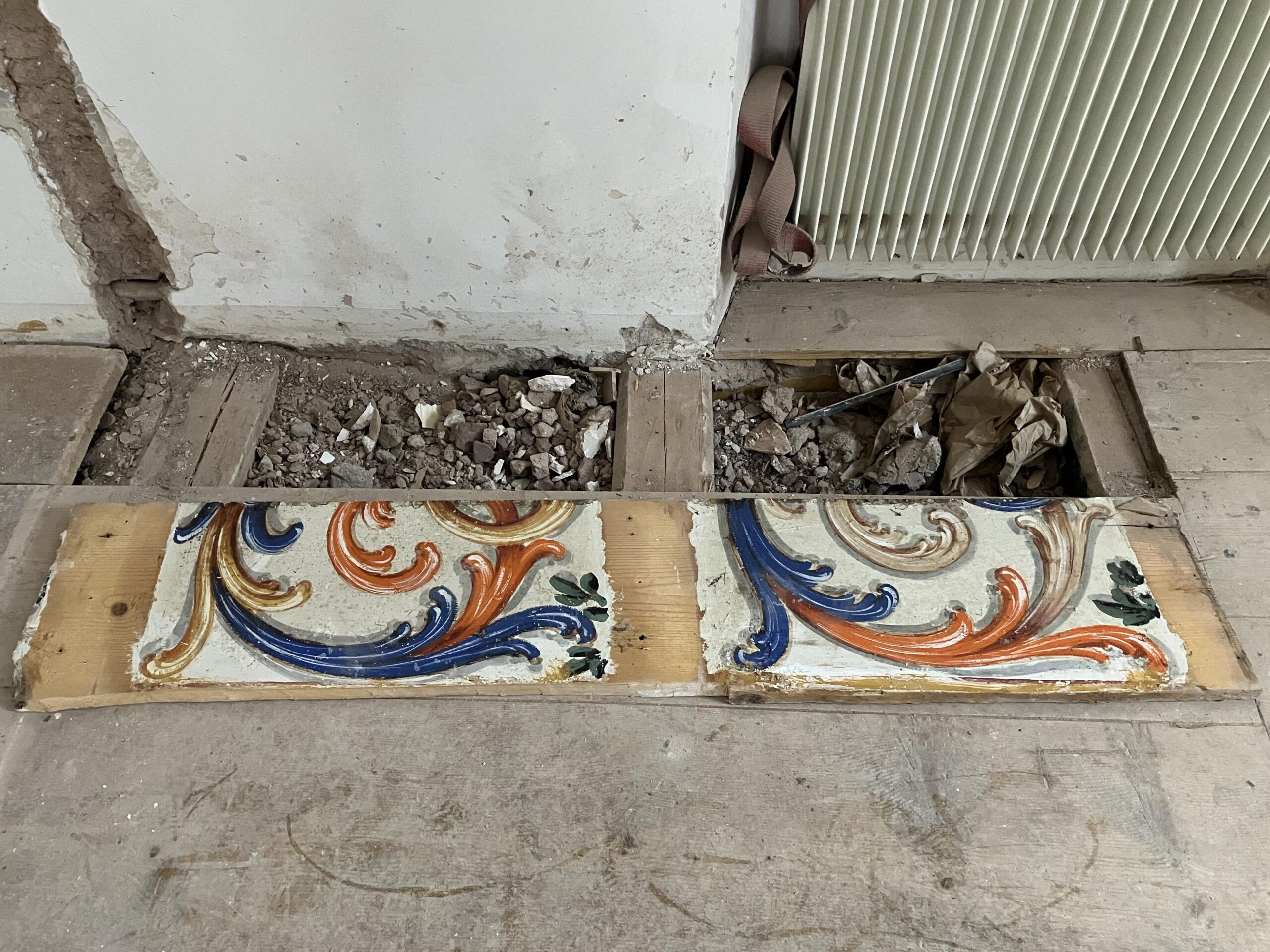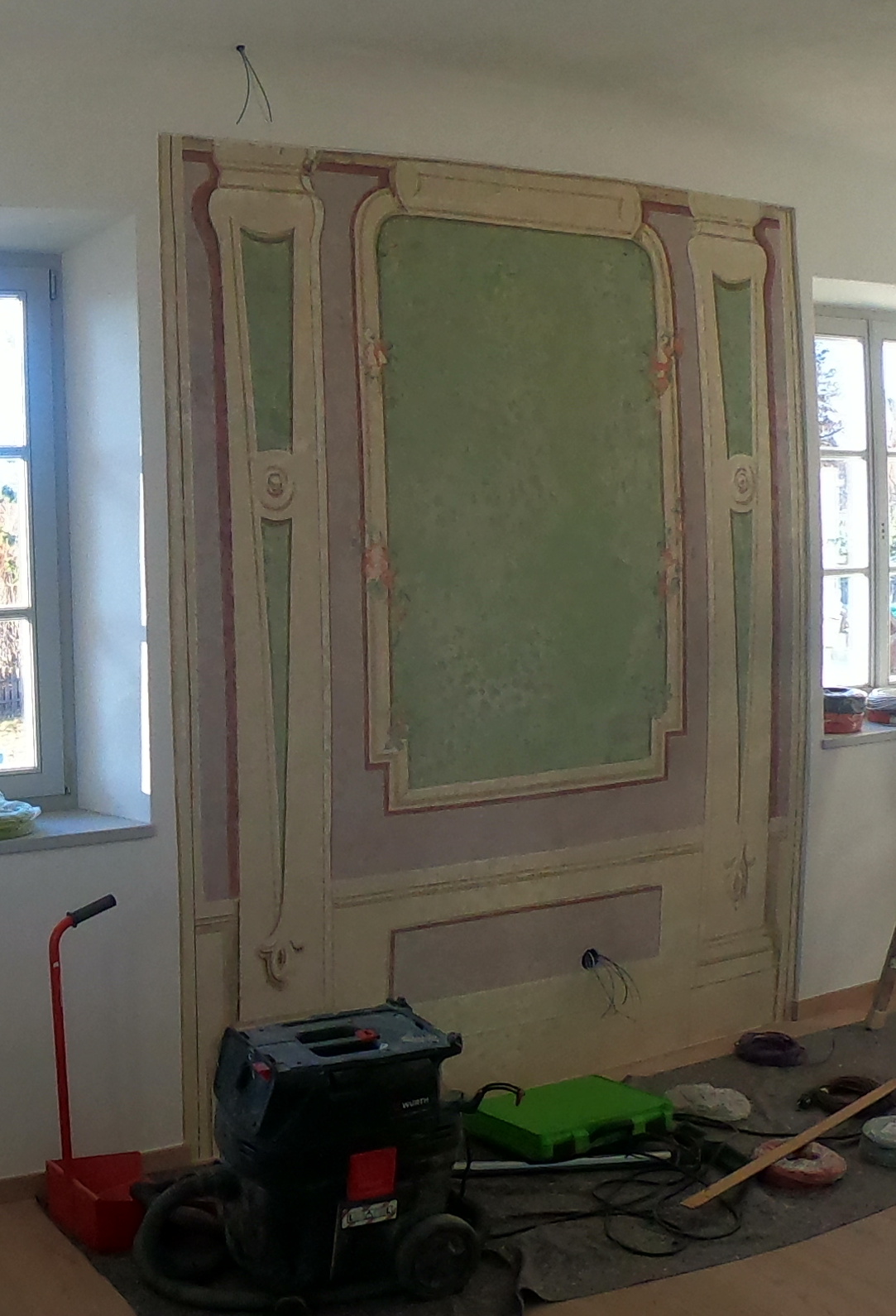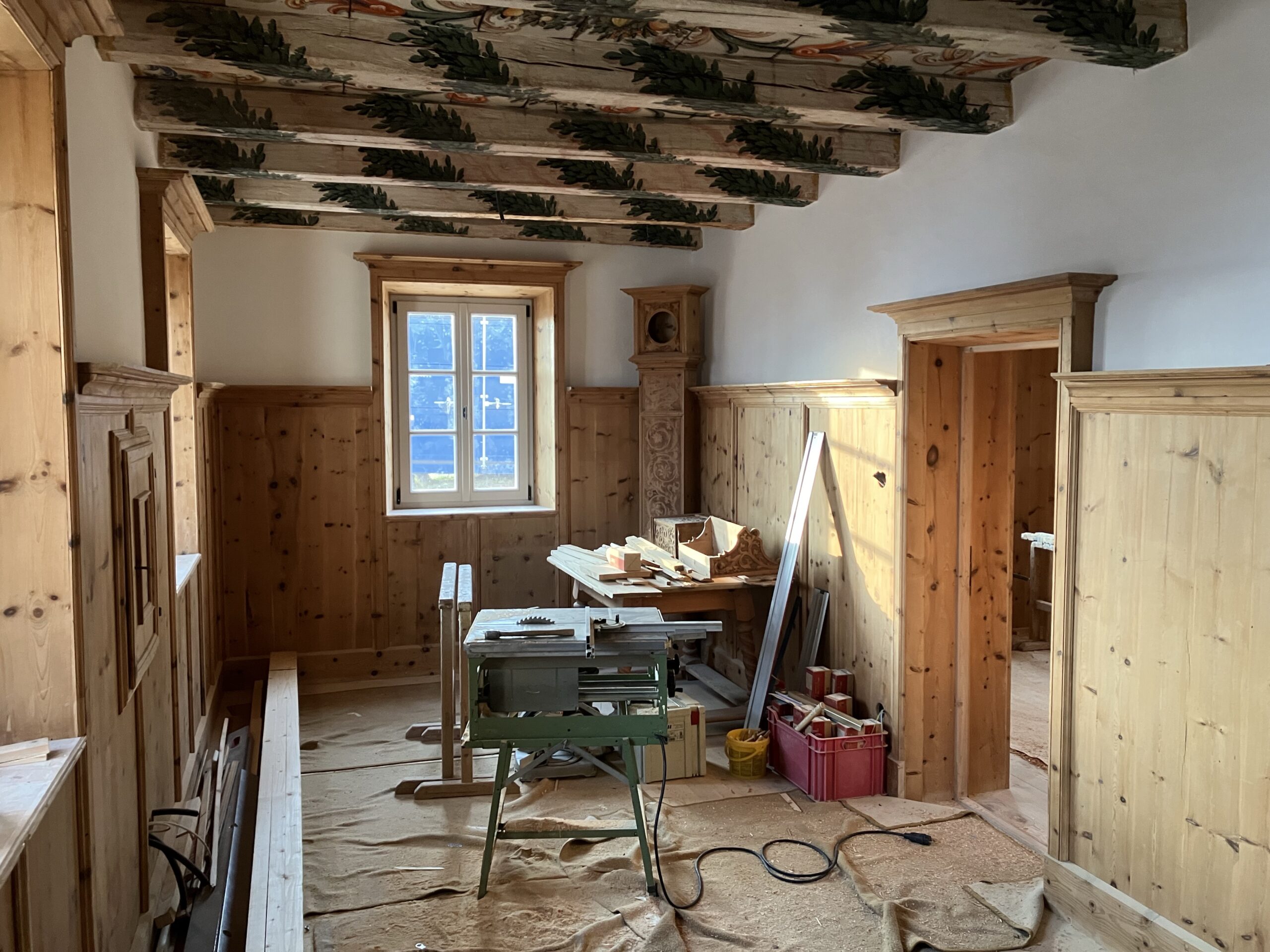 Entnahme der Täfelungen und der Holzböden, Entdeckung der Schablonenmalerei