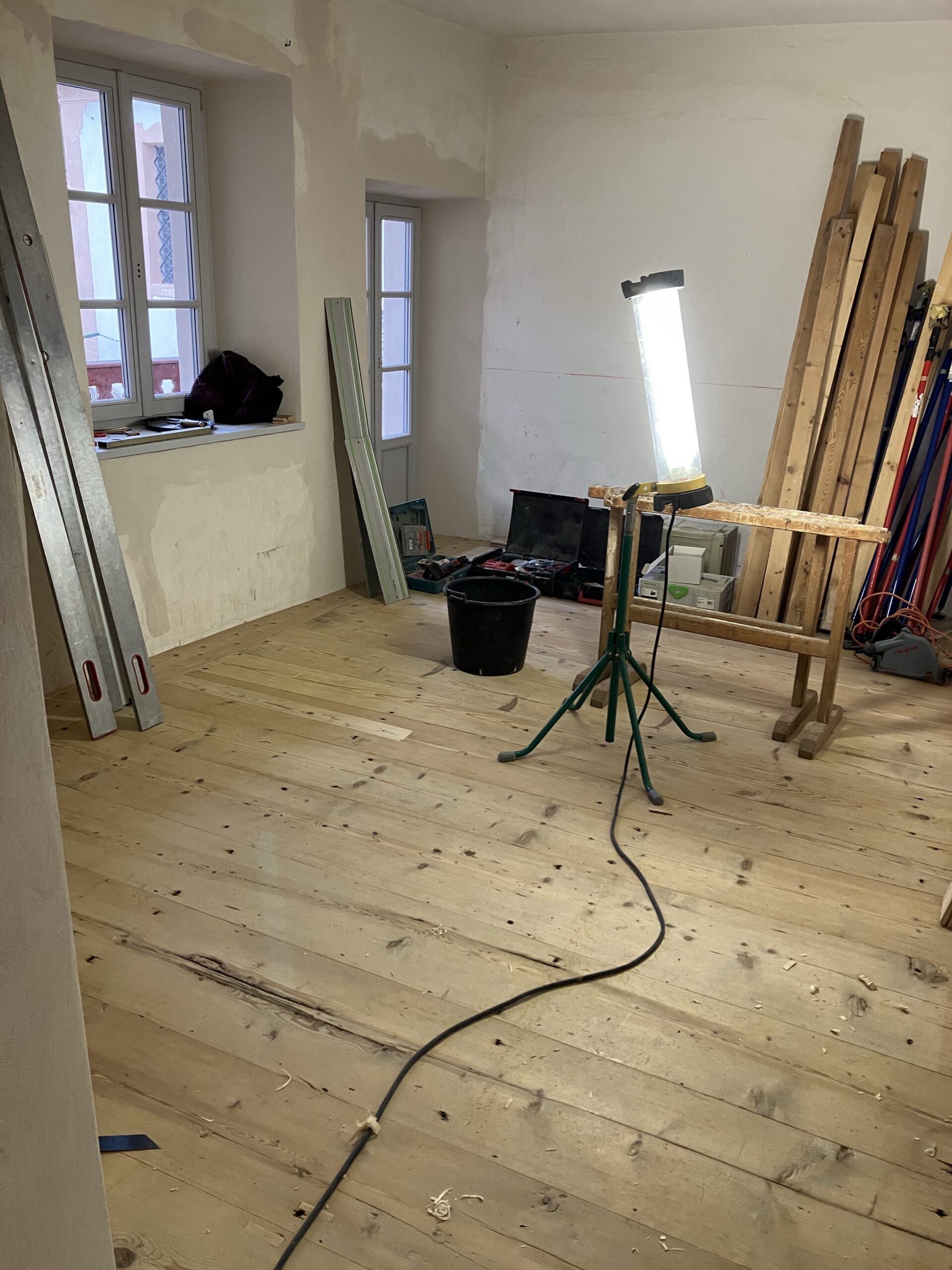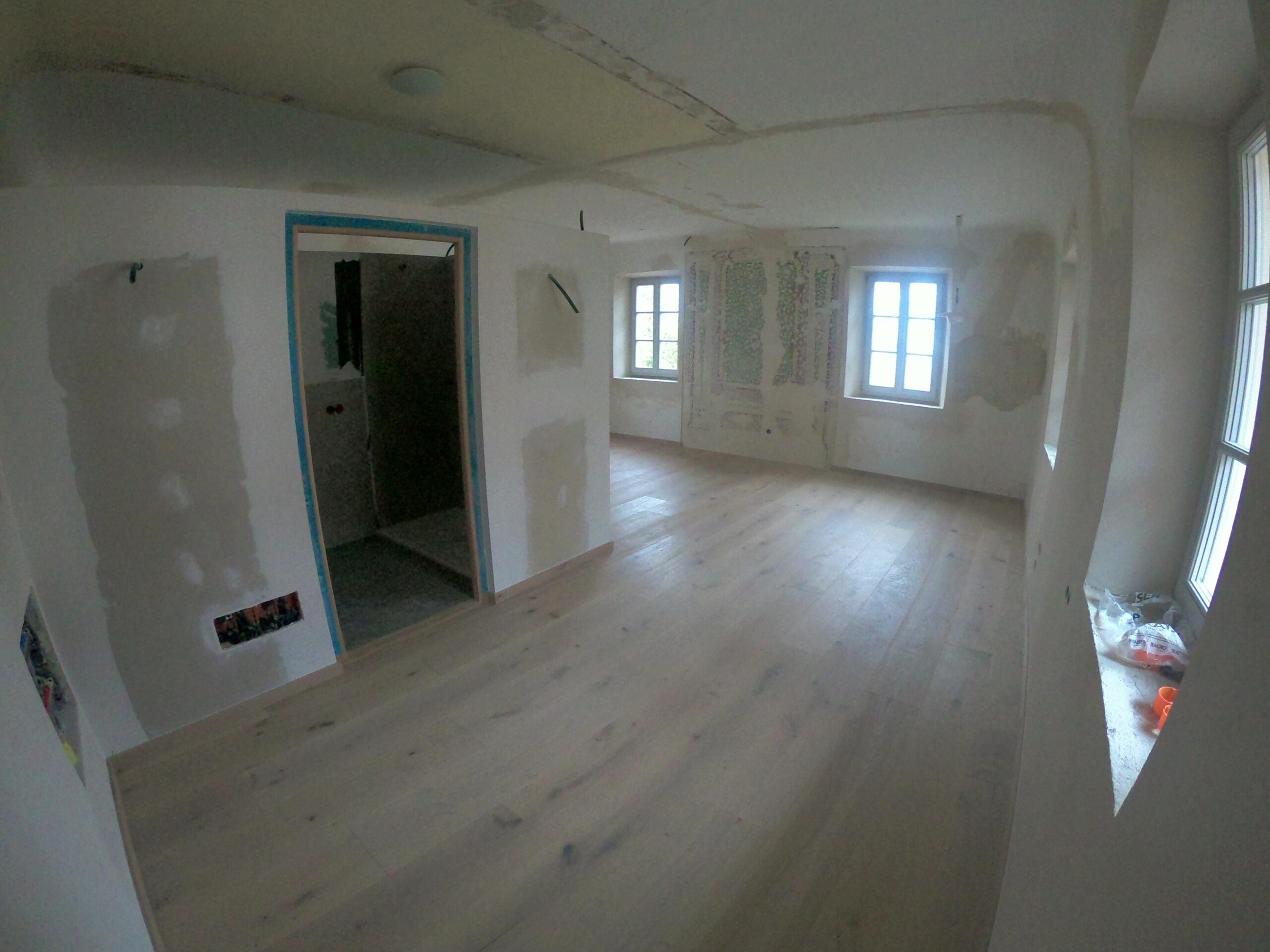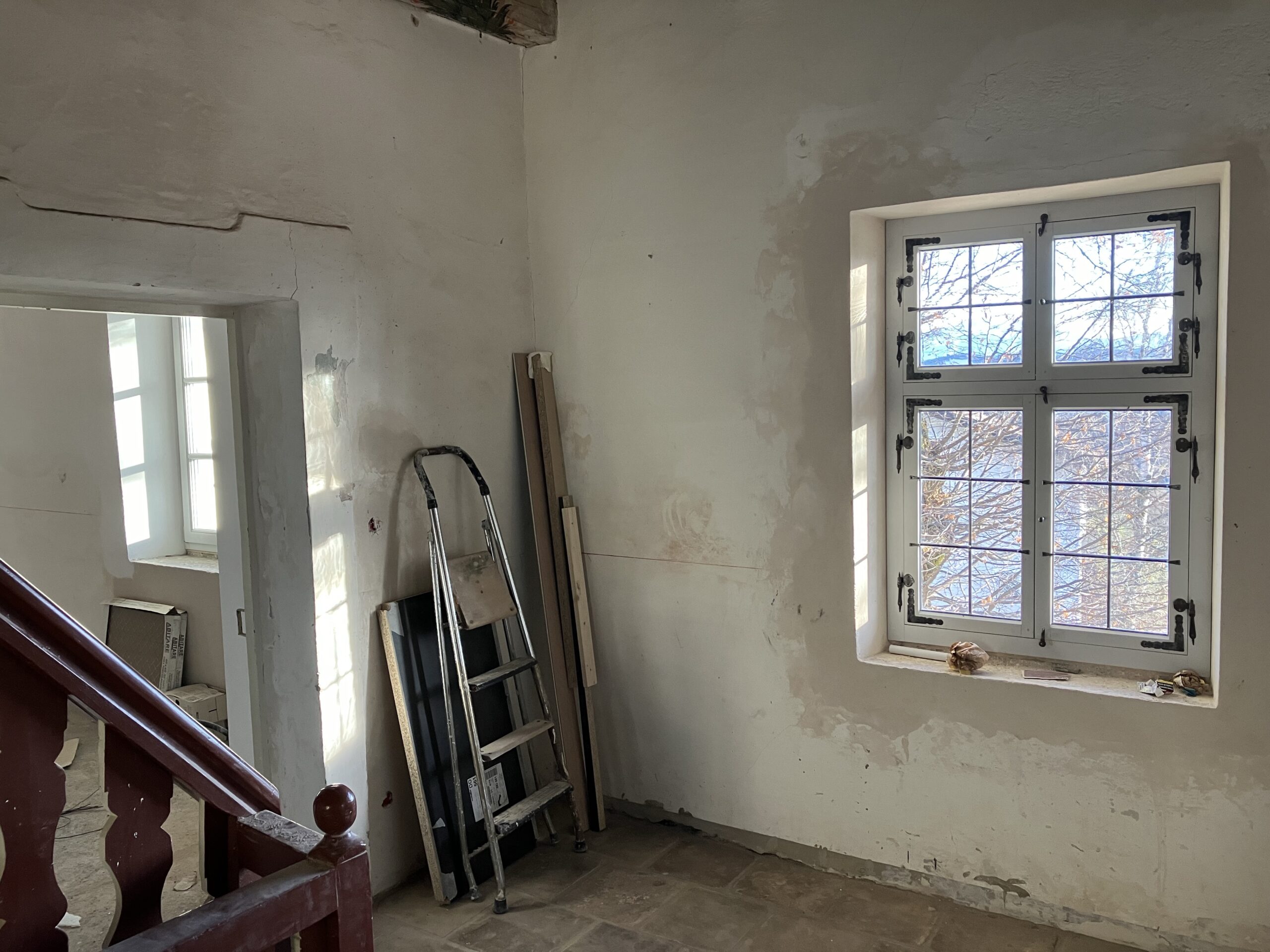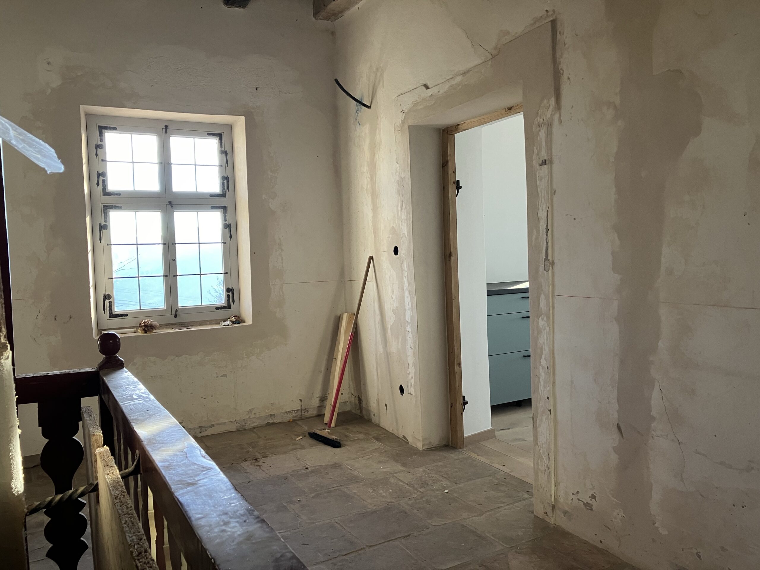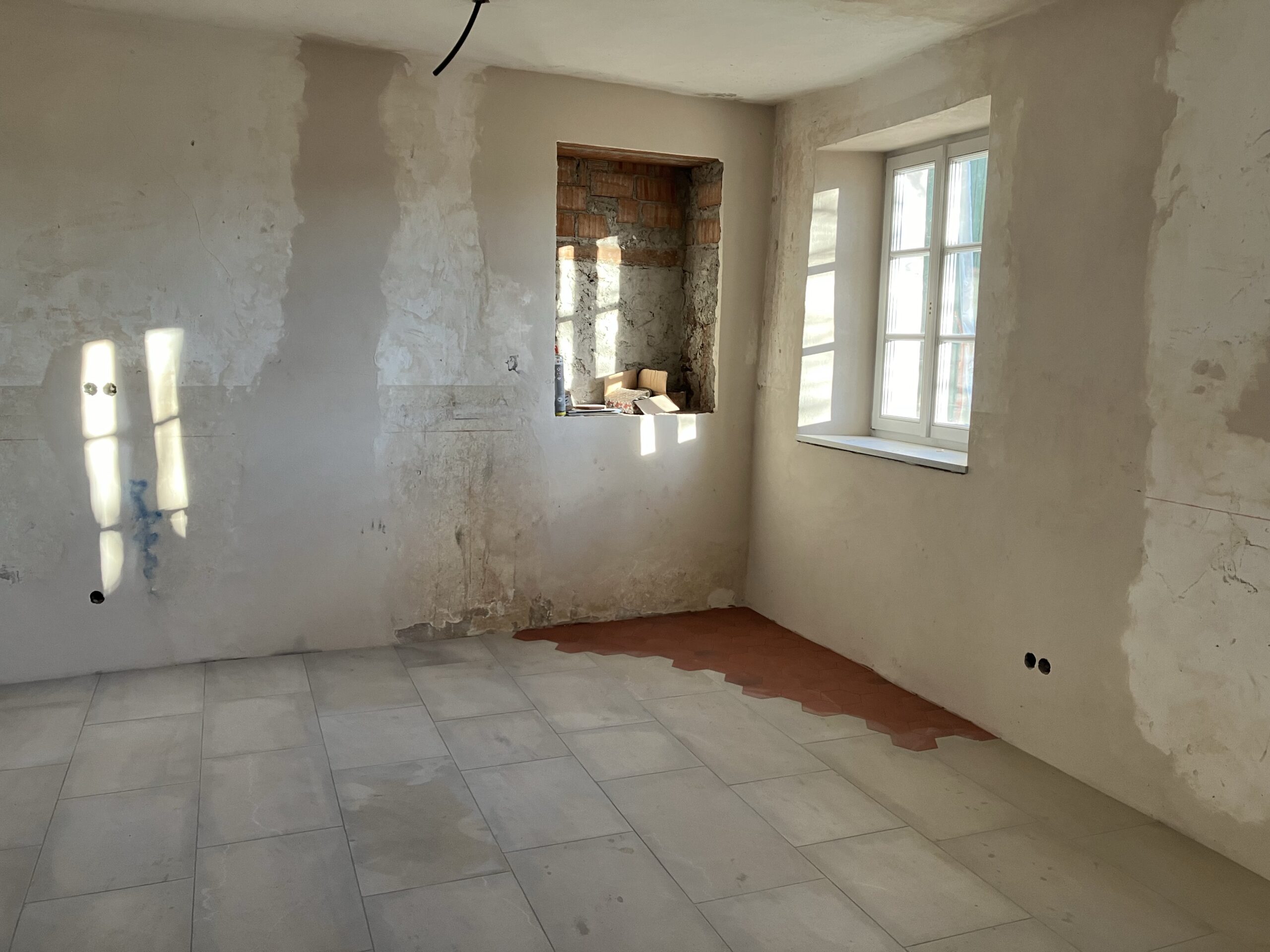 Verlegung Sandsteinplatten innen, neue Holzböden und Fließen