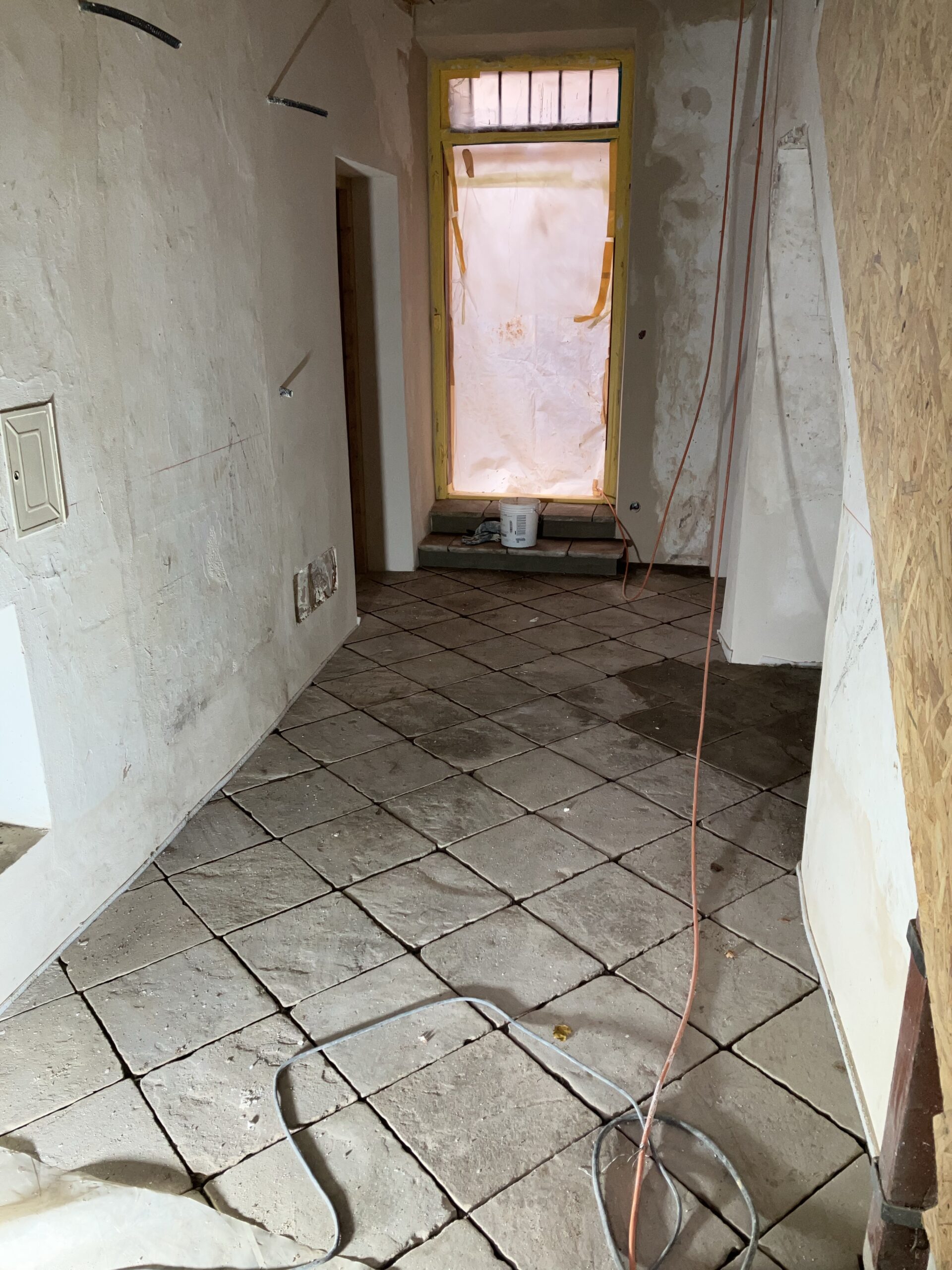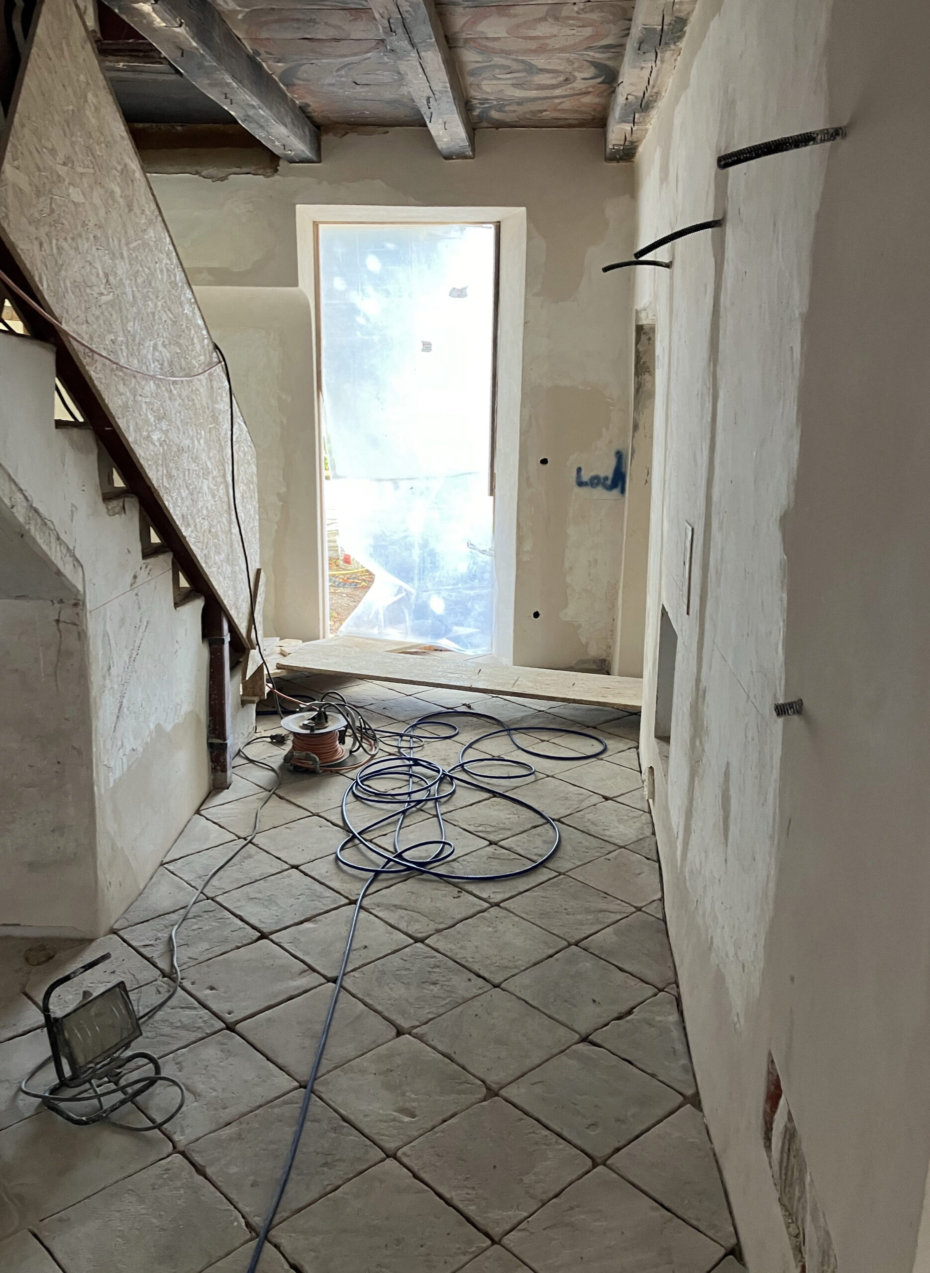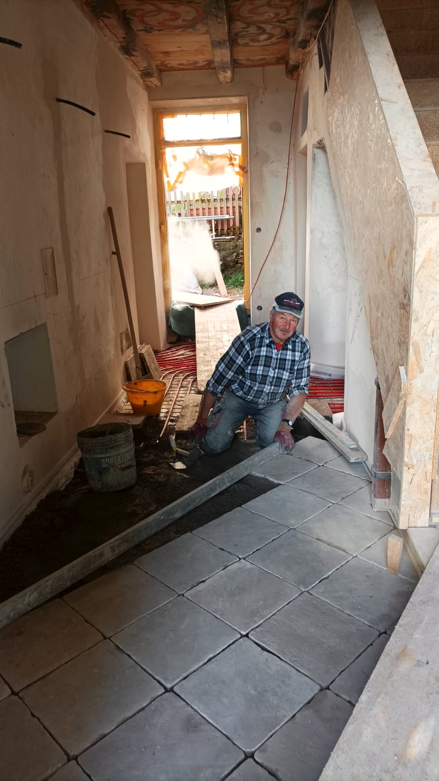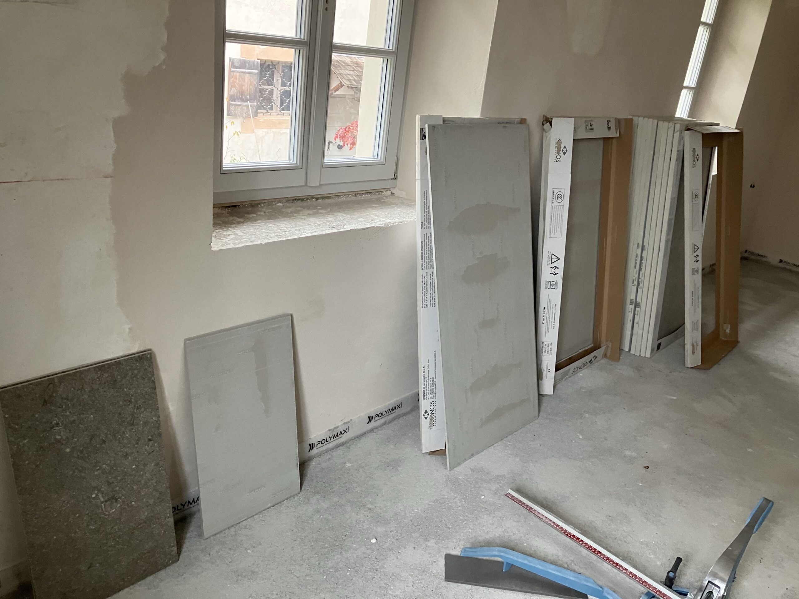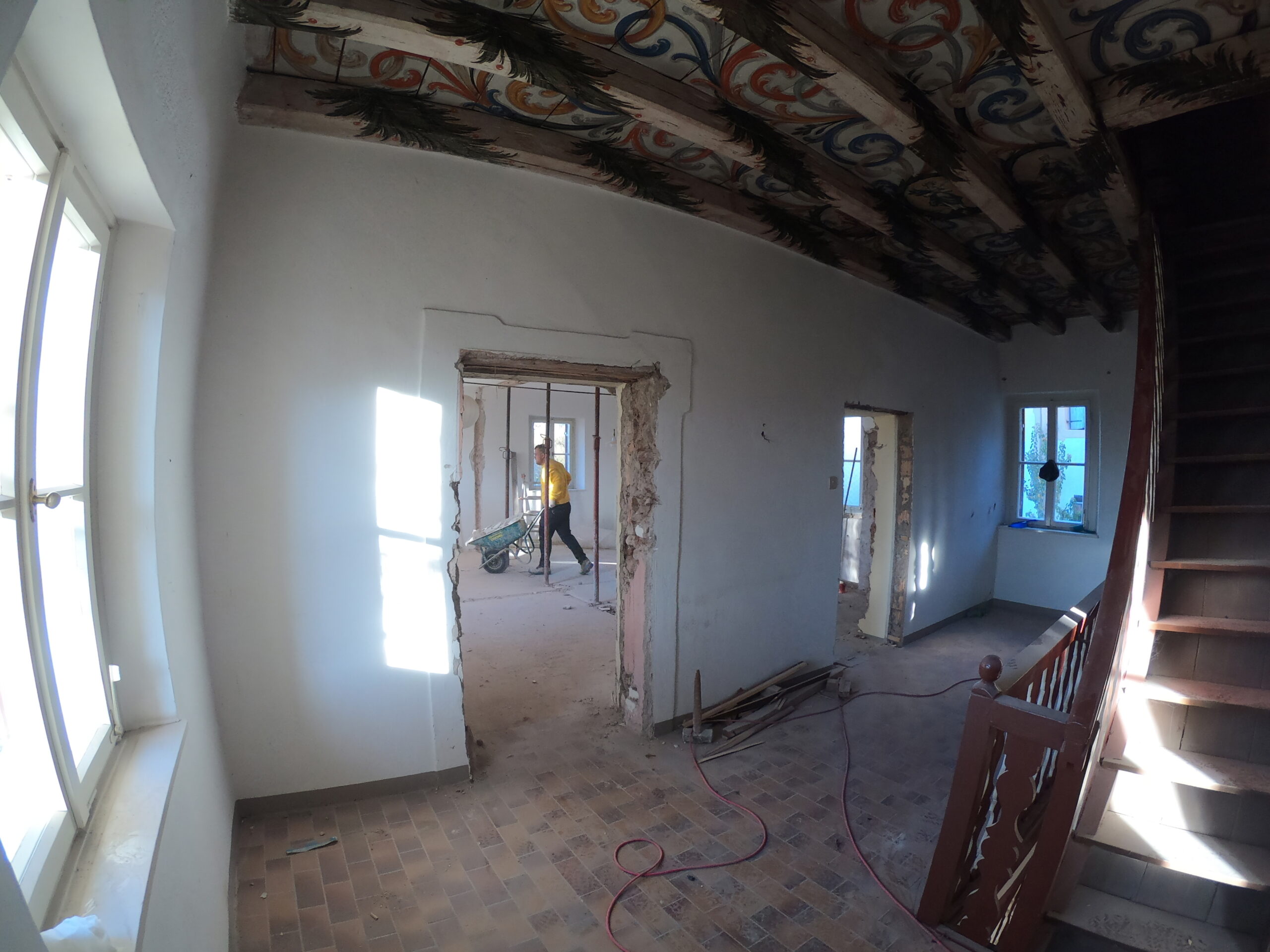 Verlegung Sandsteinplatten innen, neue Holzböden und Fließen