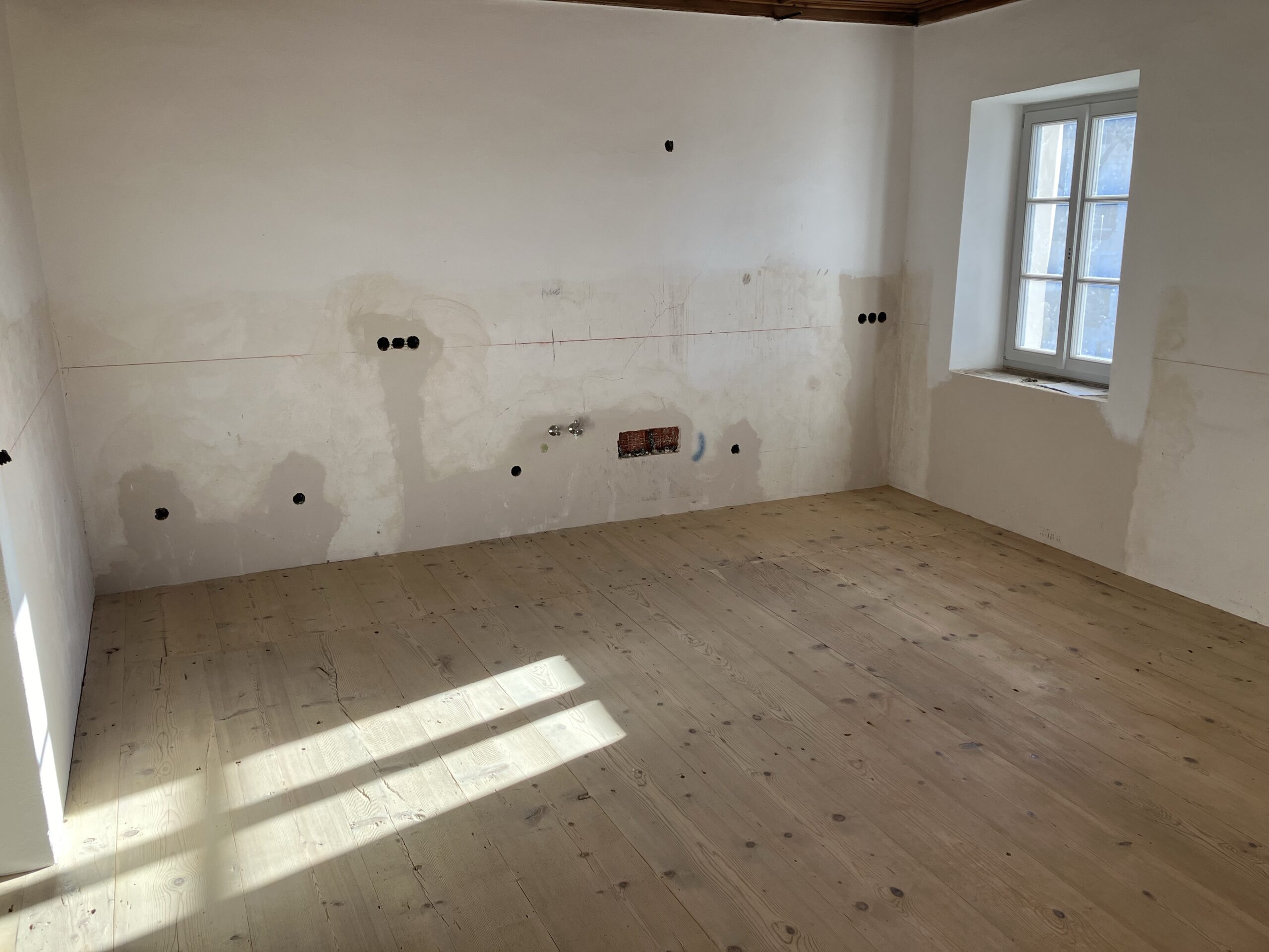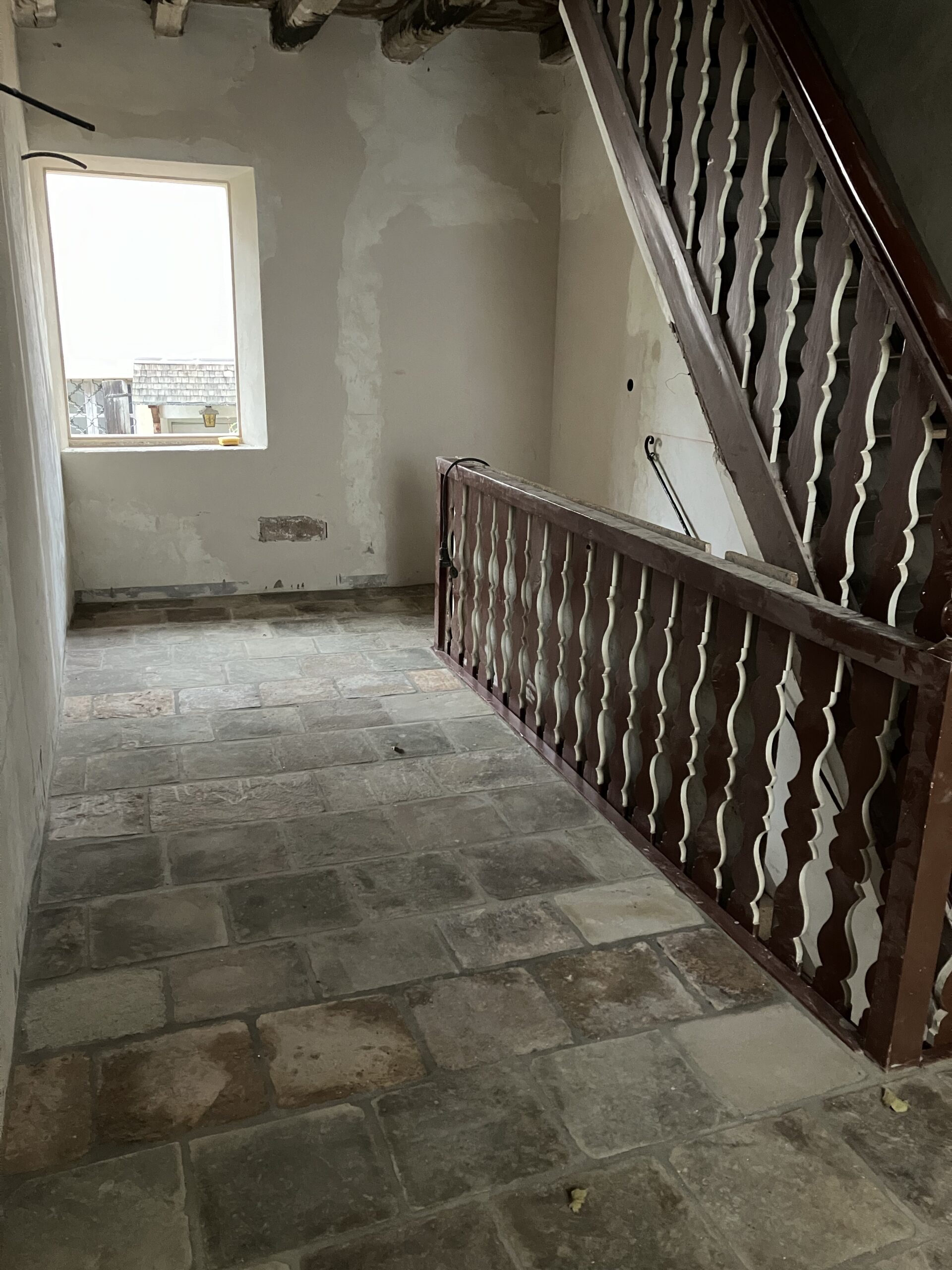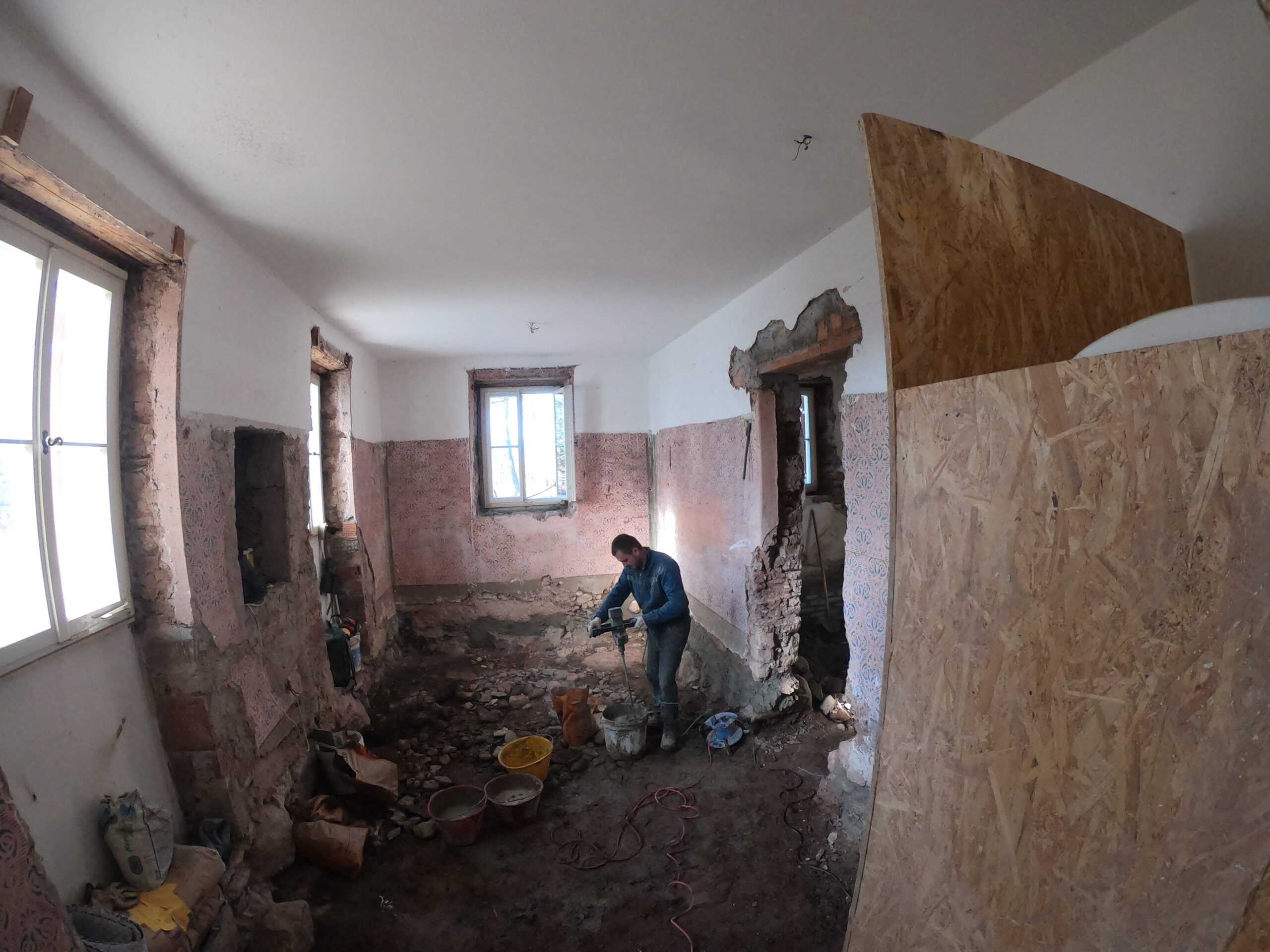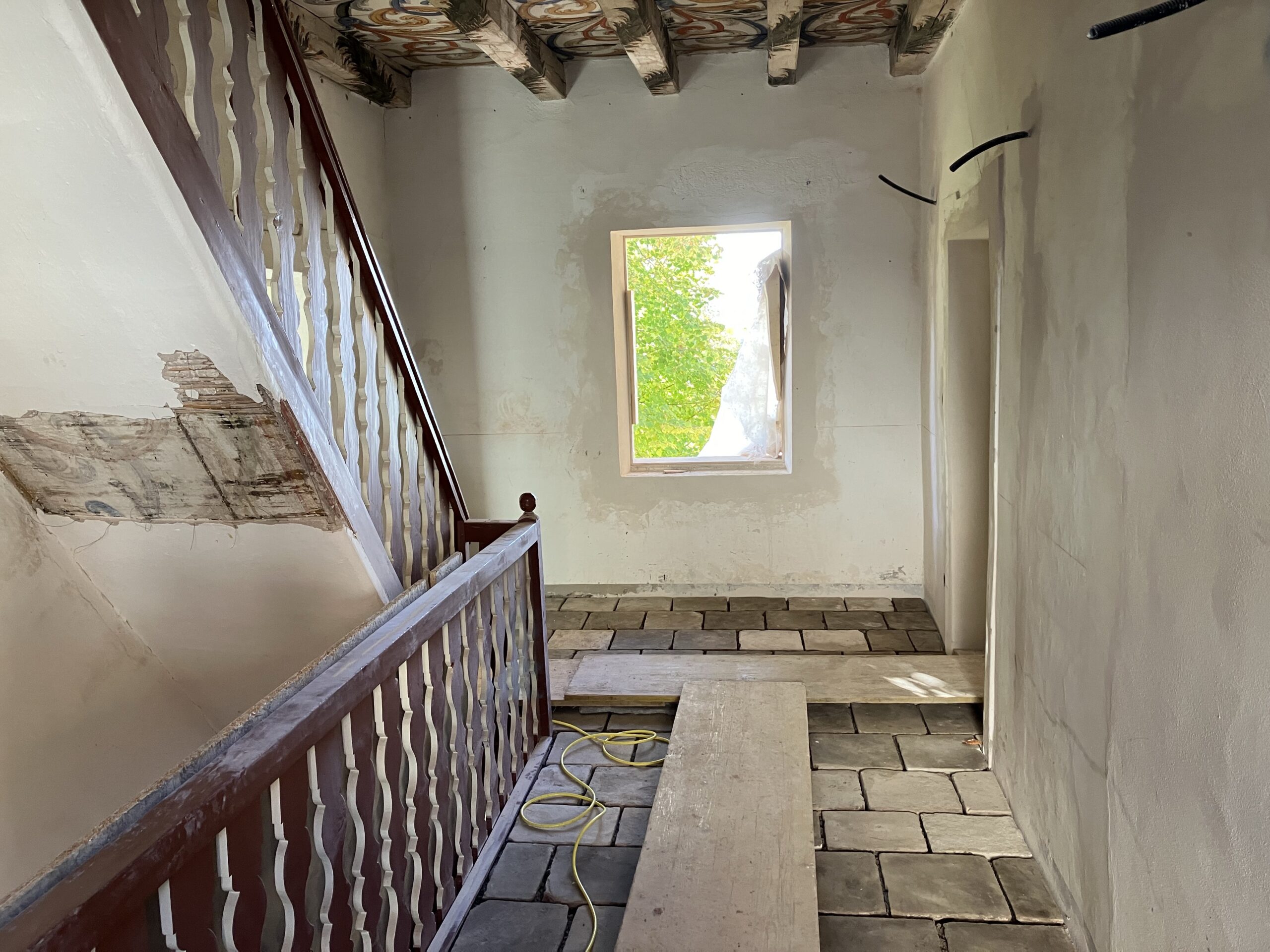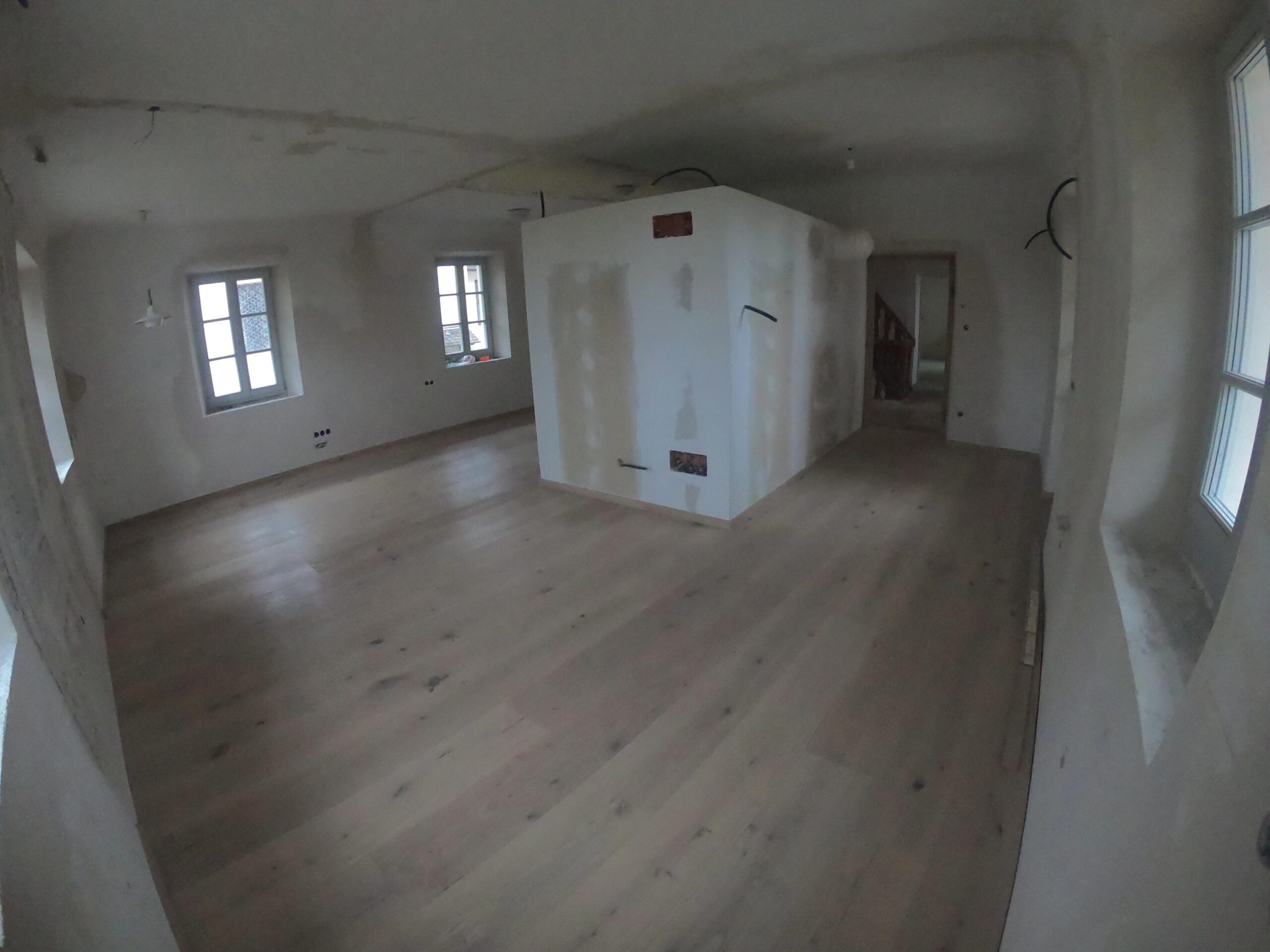 Verlegung Sandsteinplatten innen, neue Holzböden und Fließen