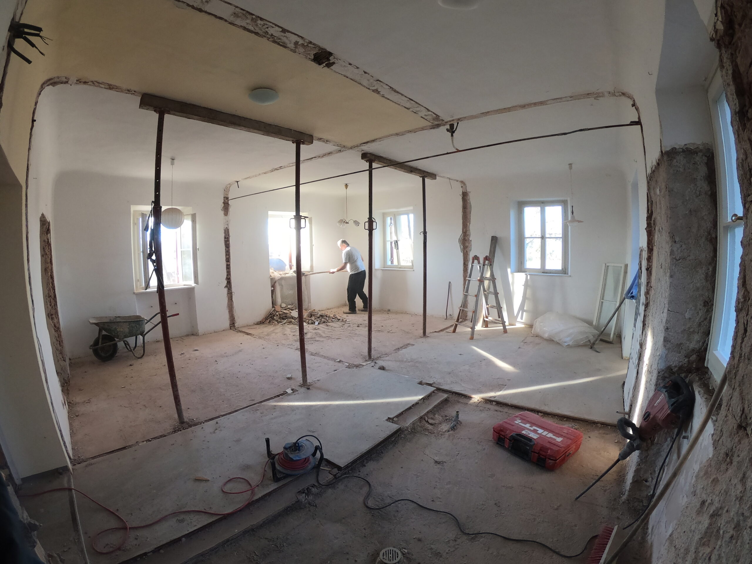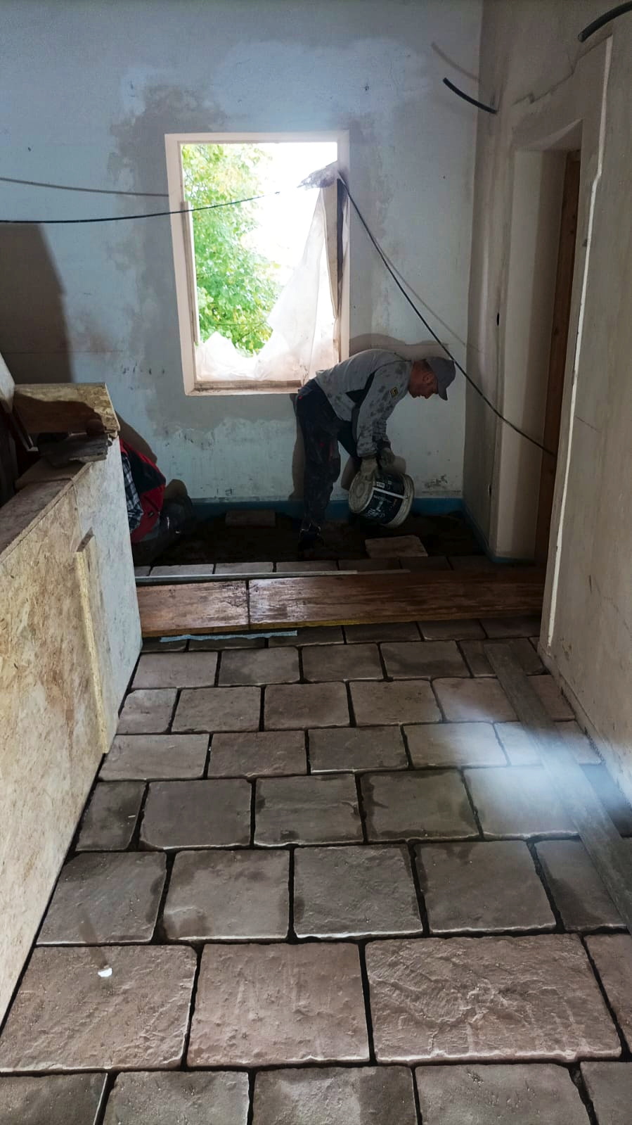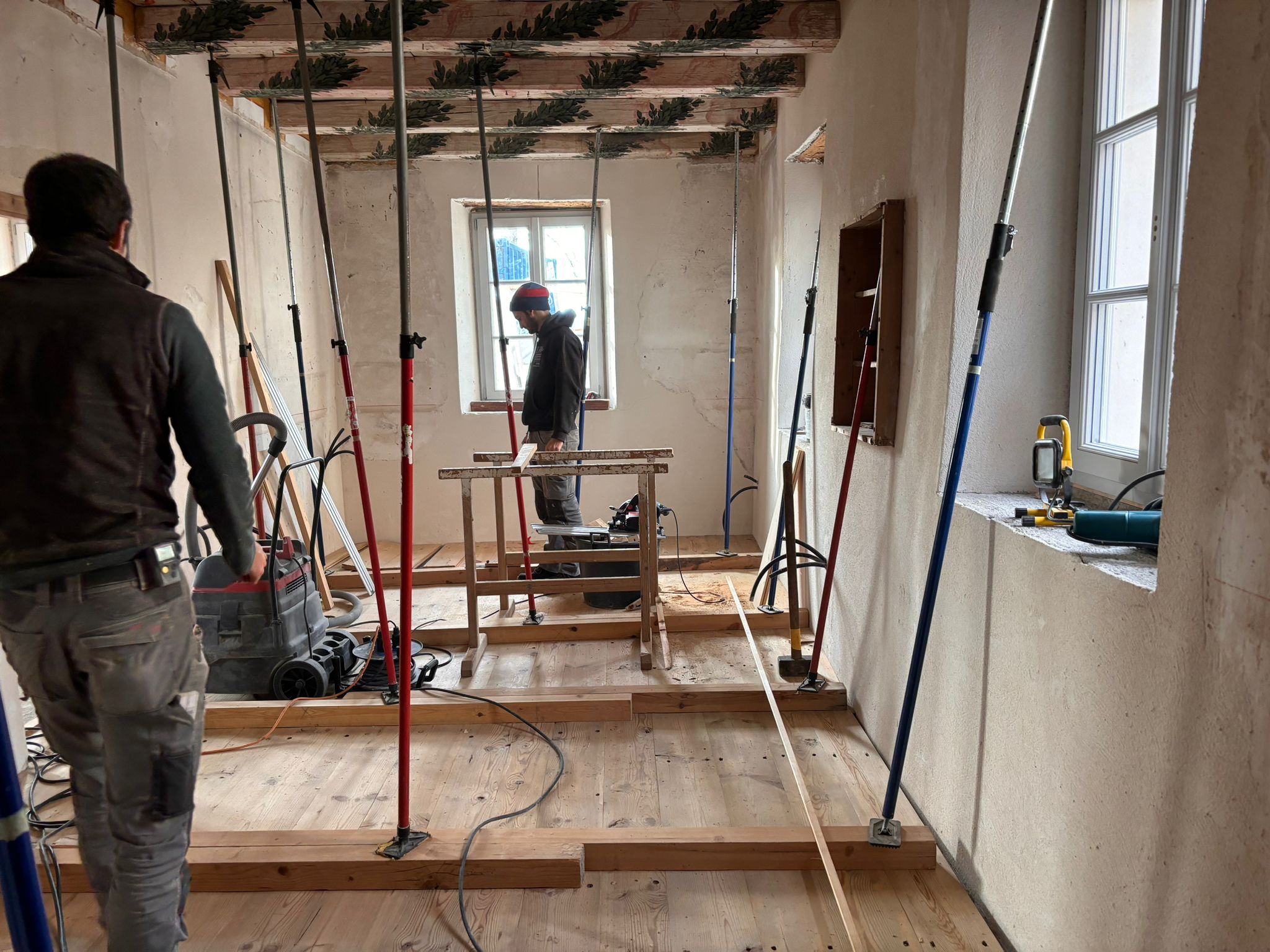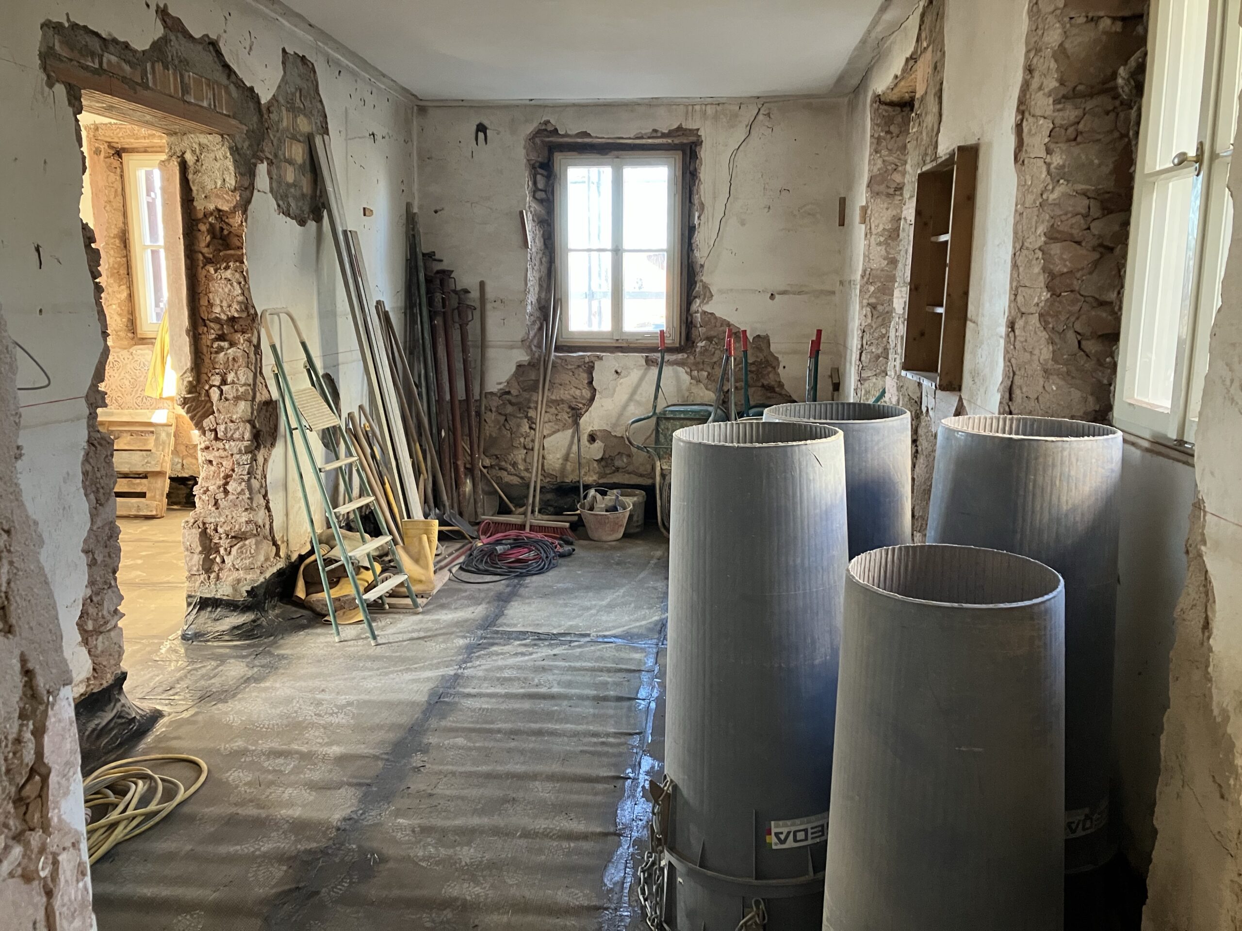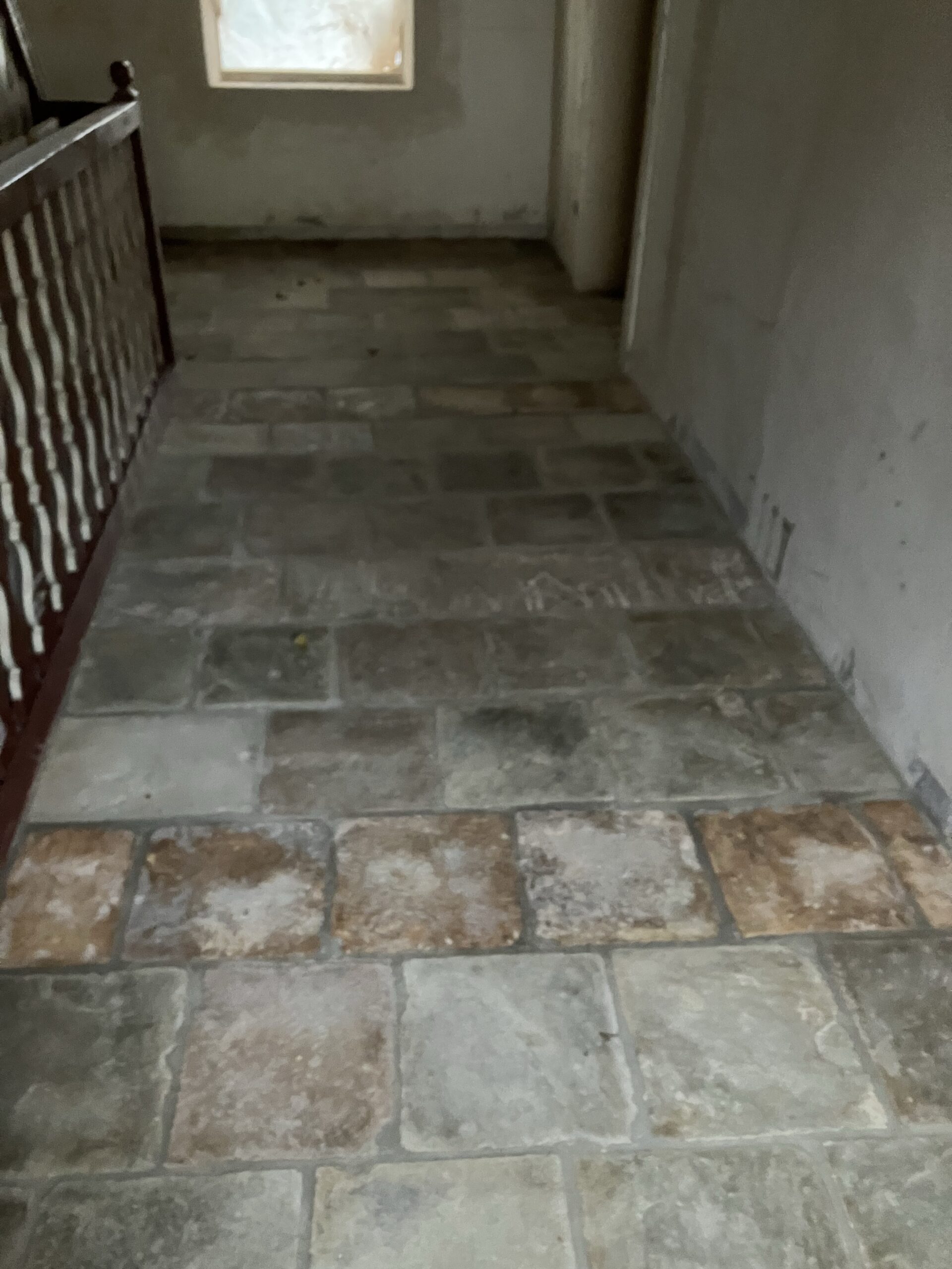 Verlegung Sandsteinplatten innen, neue Holzböden und Fließen
