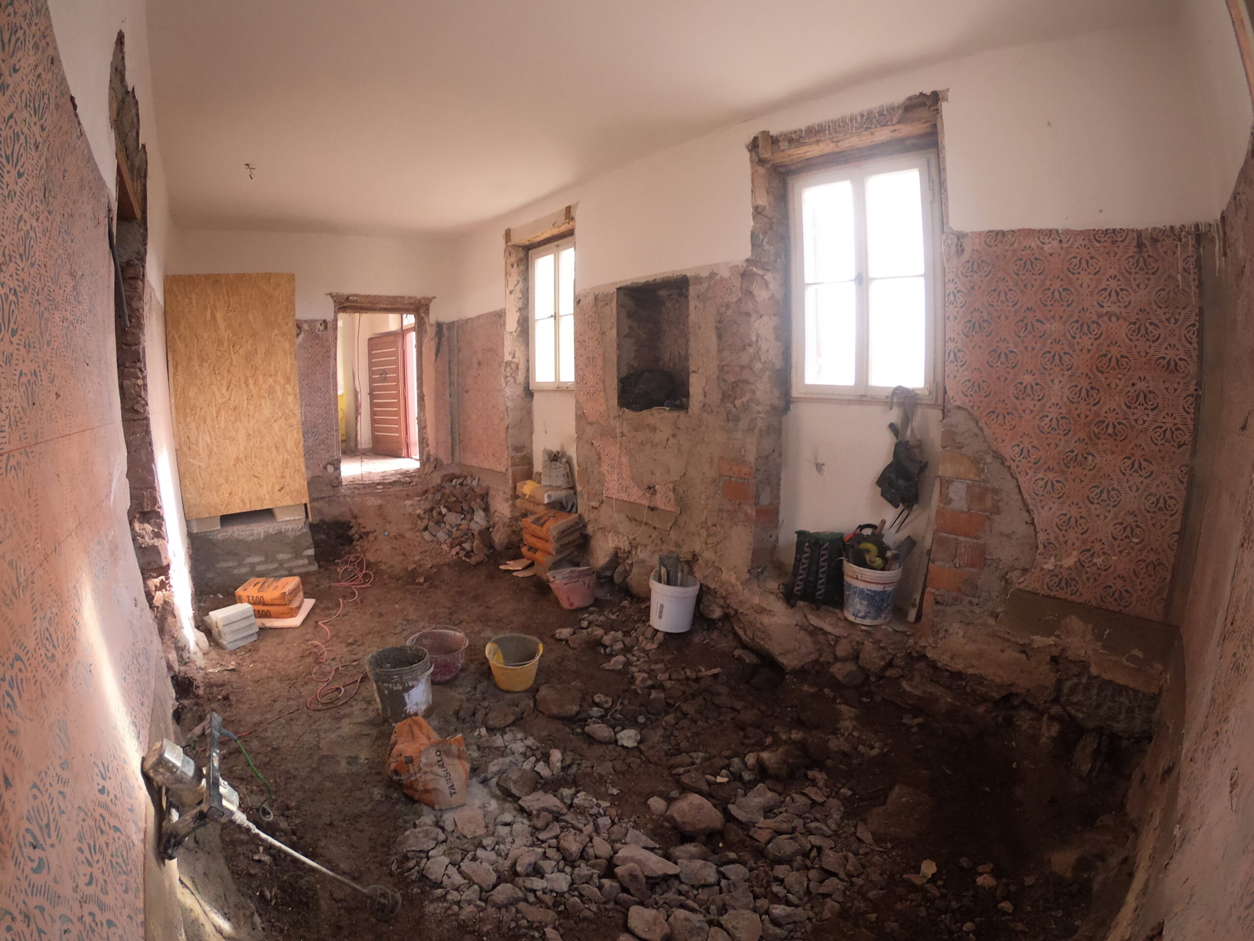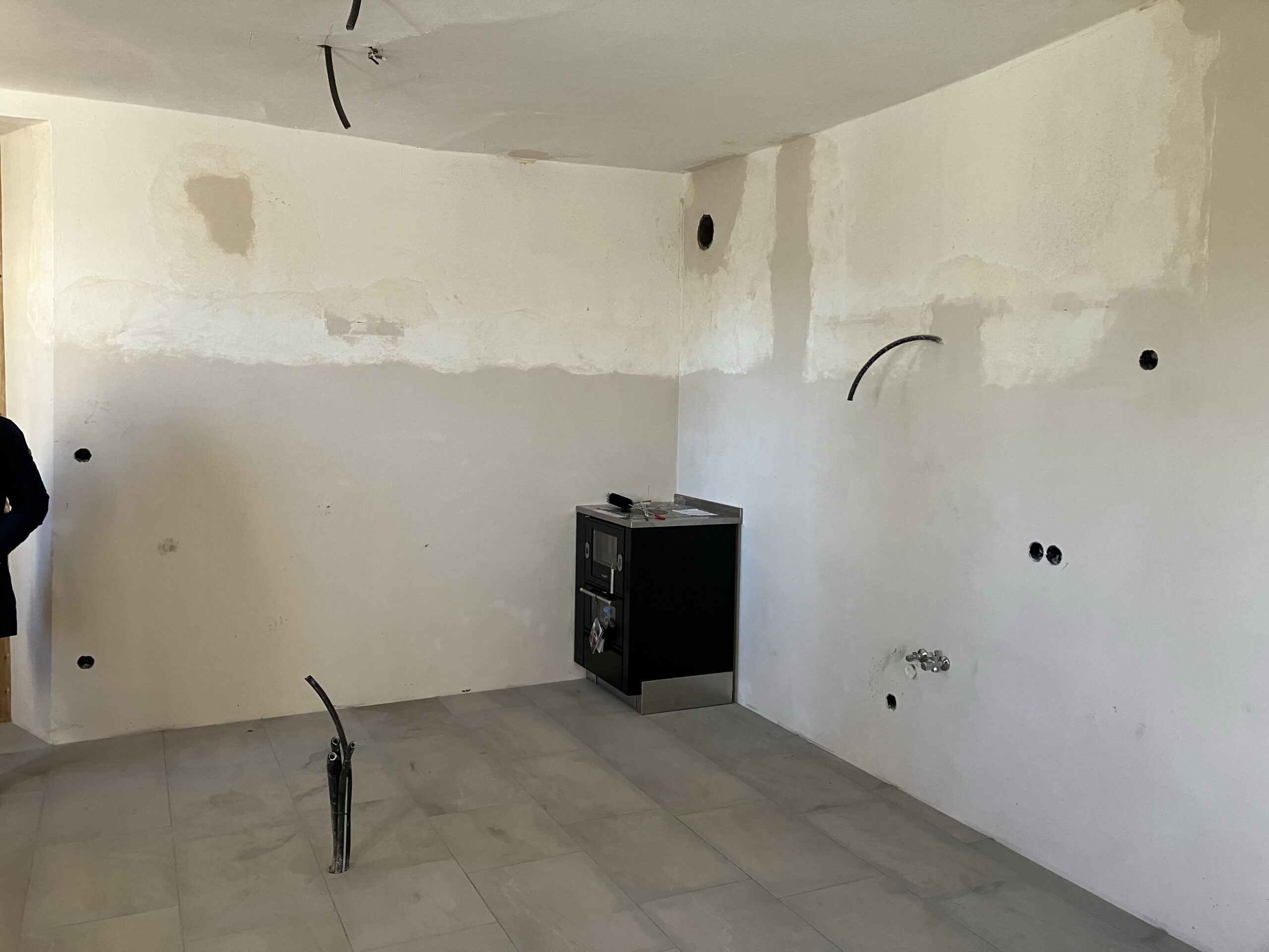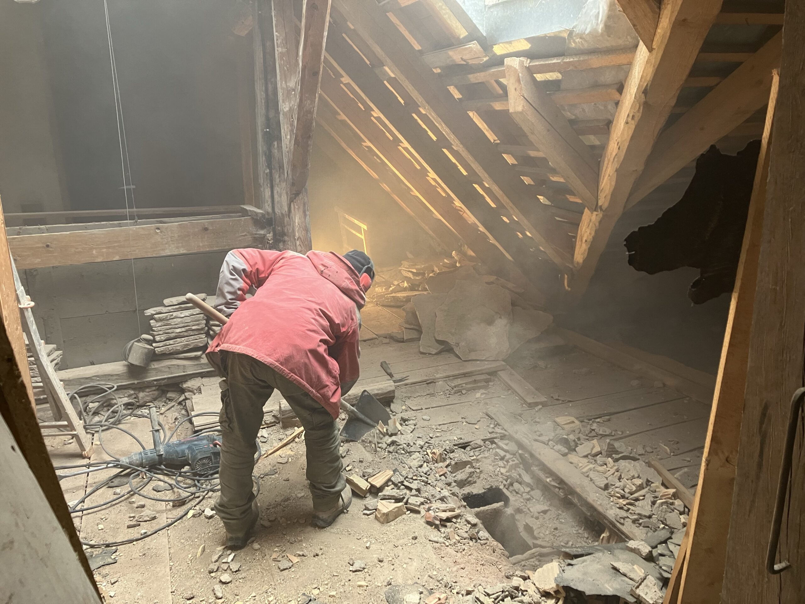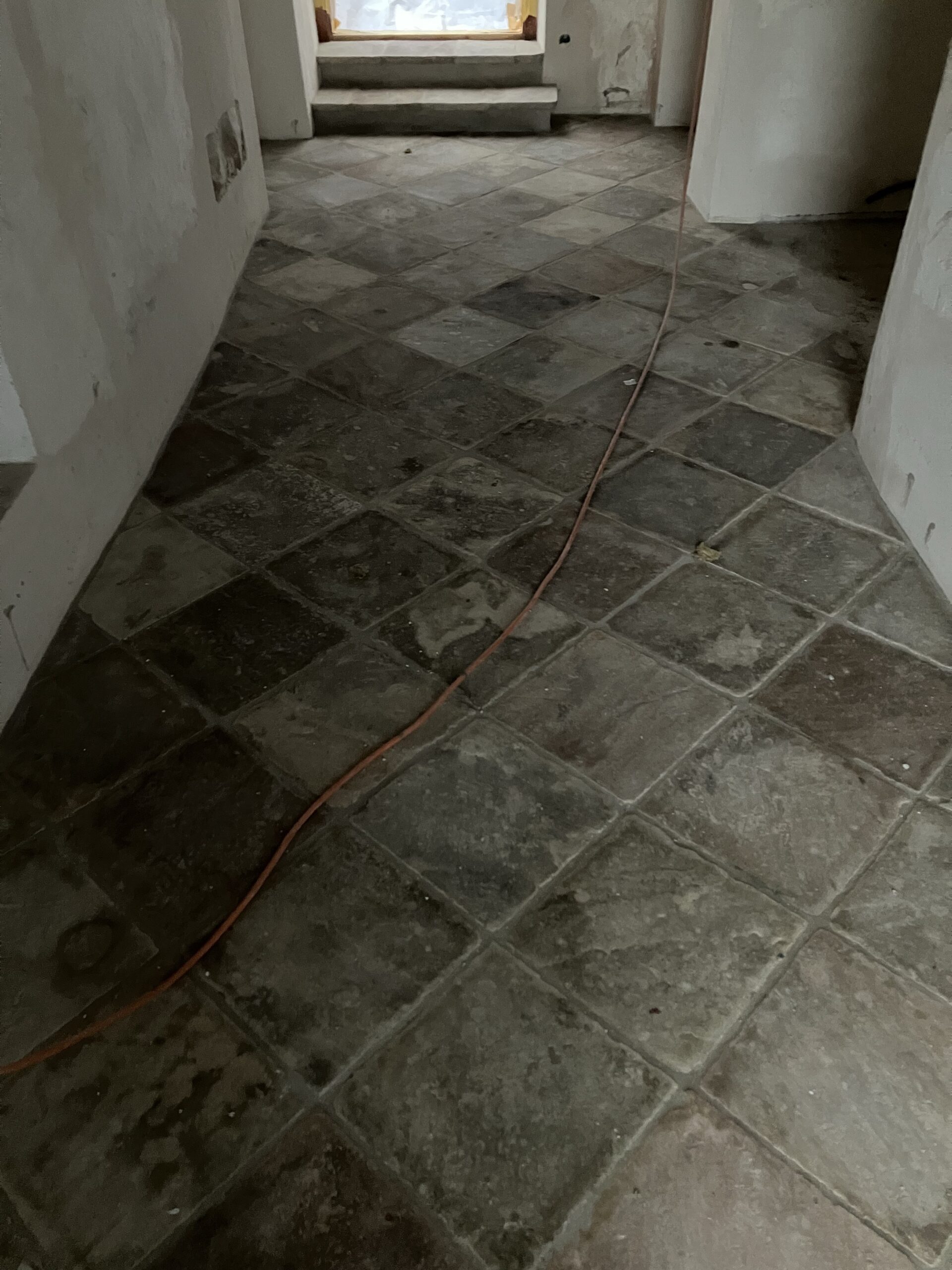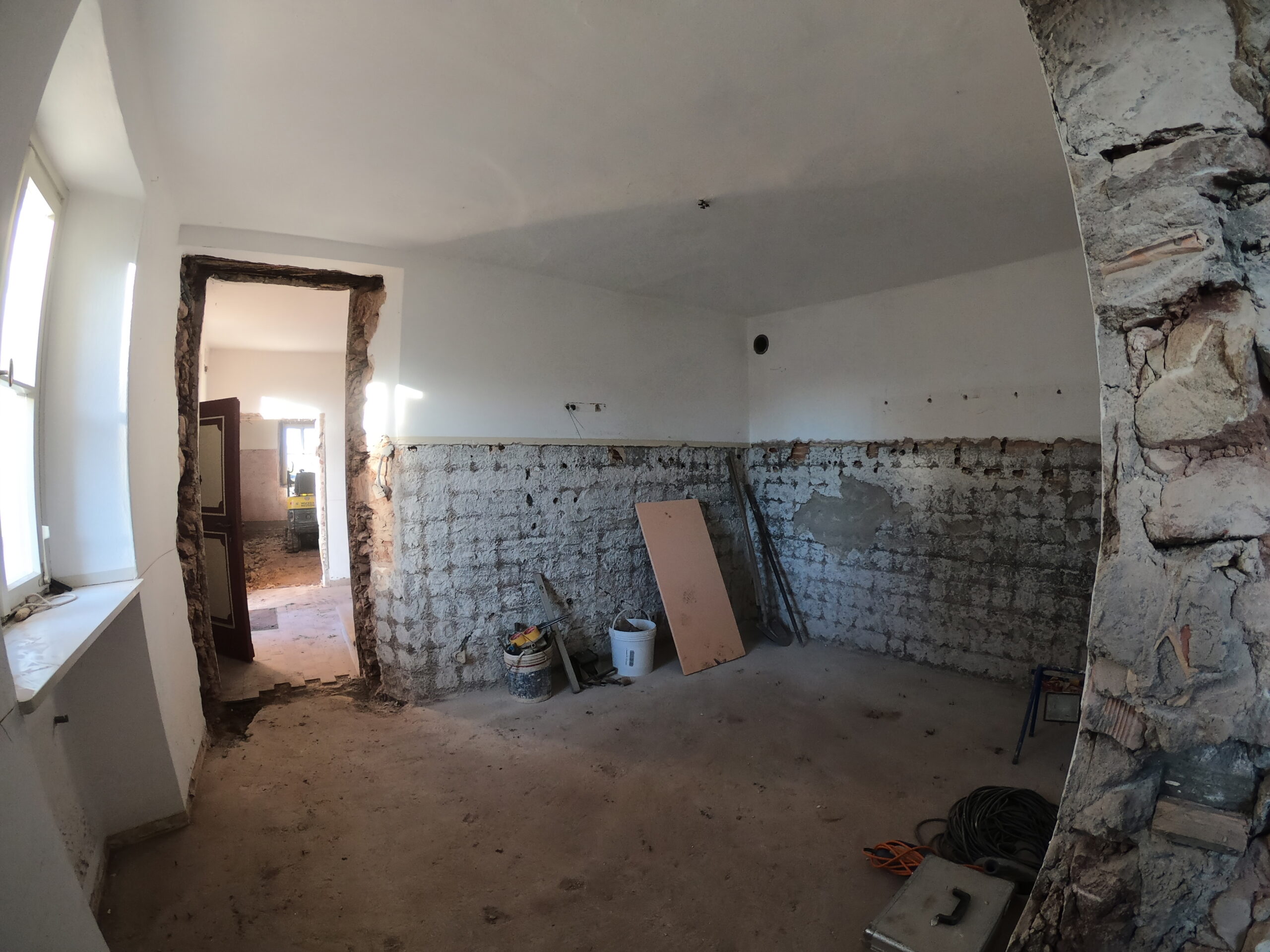 Verlegung Sandsteinplatten innen, neue Holzböden und Fließen