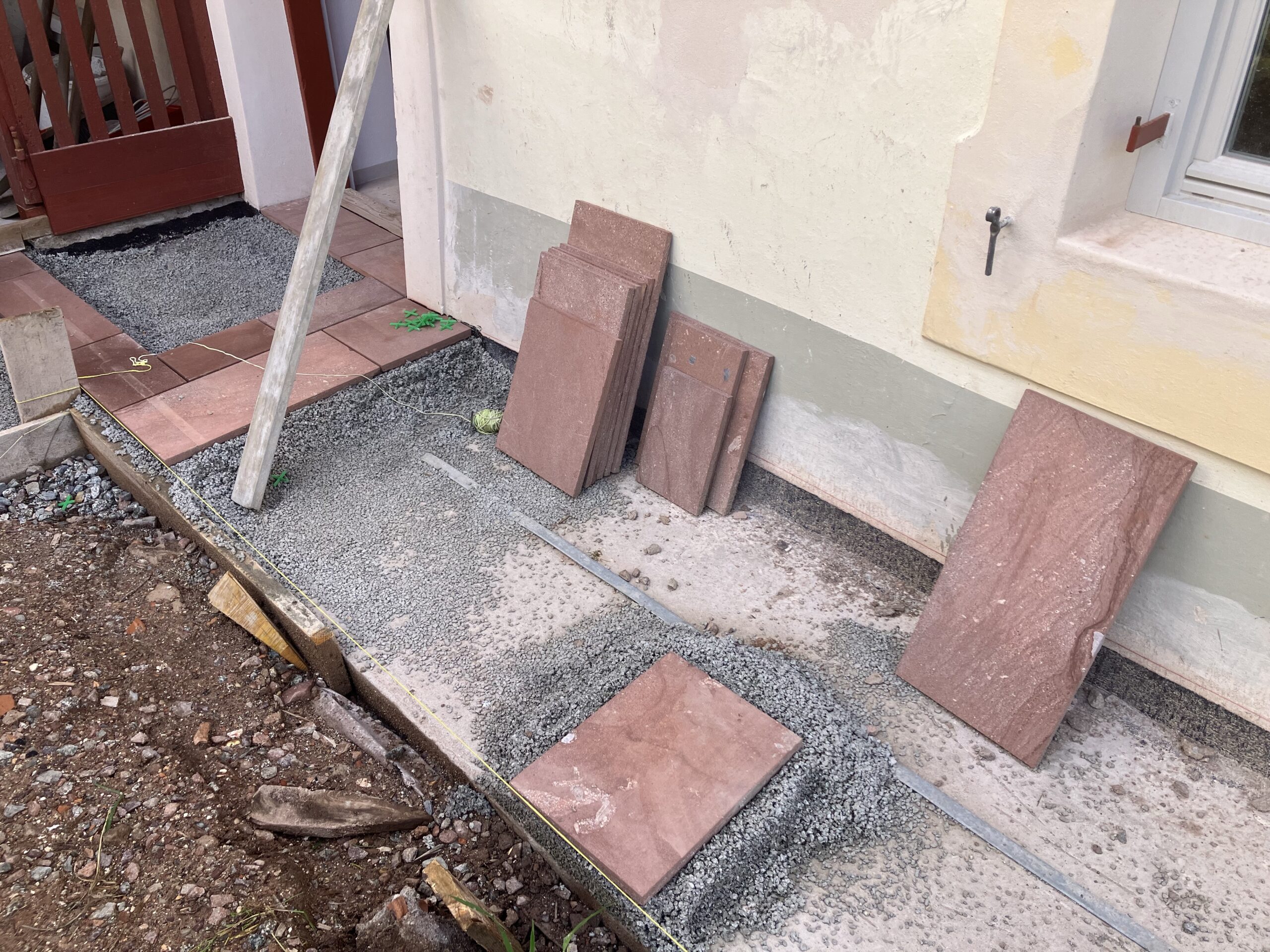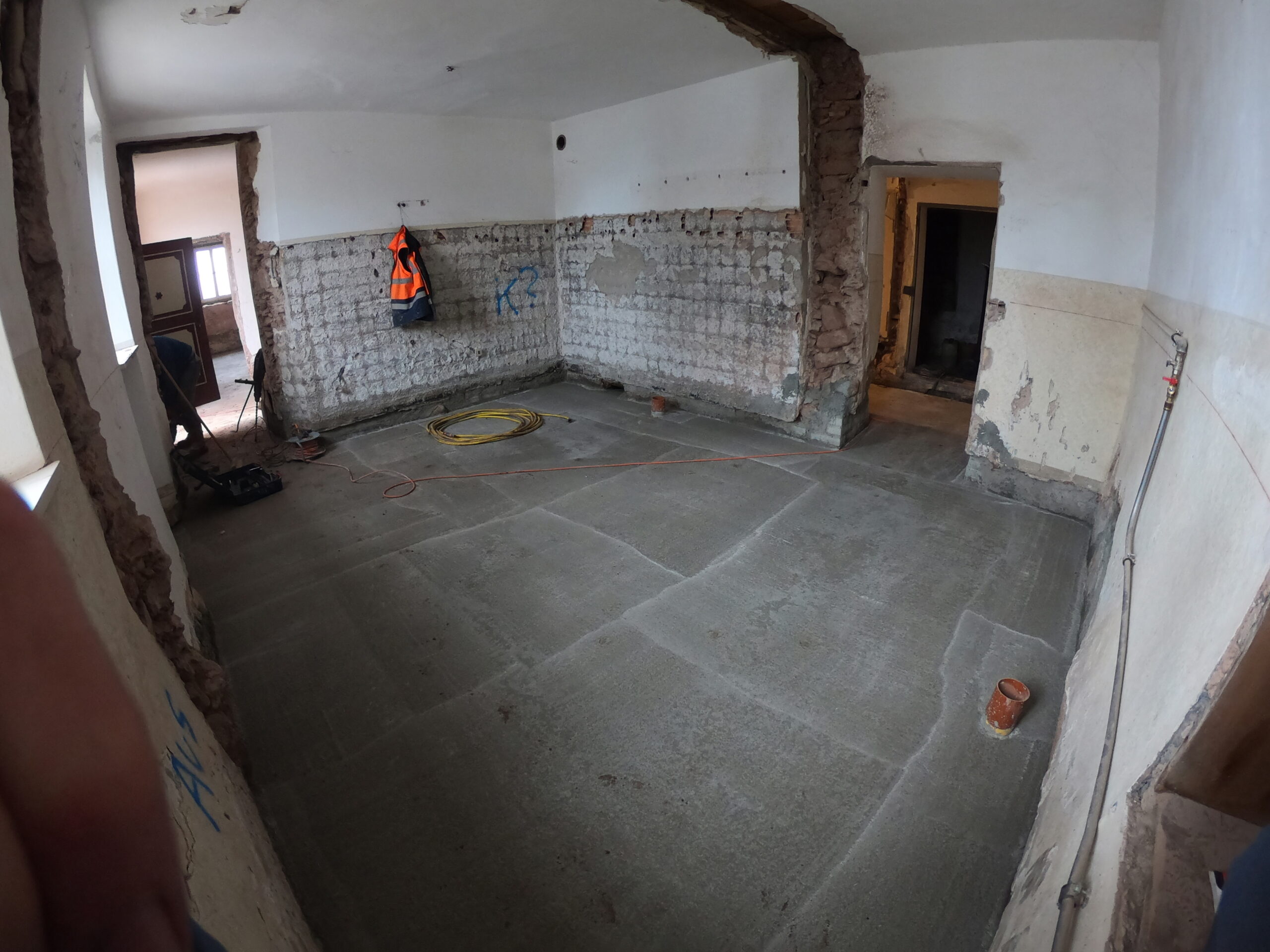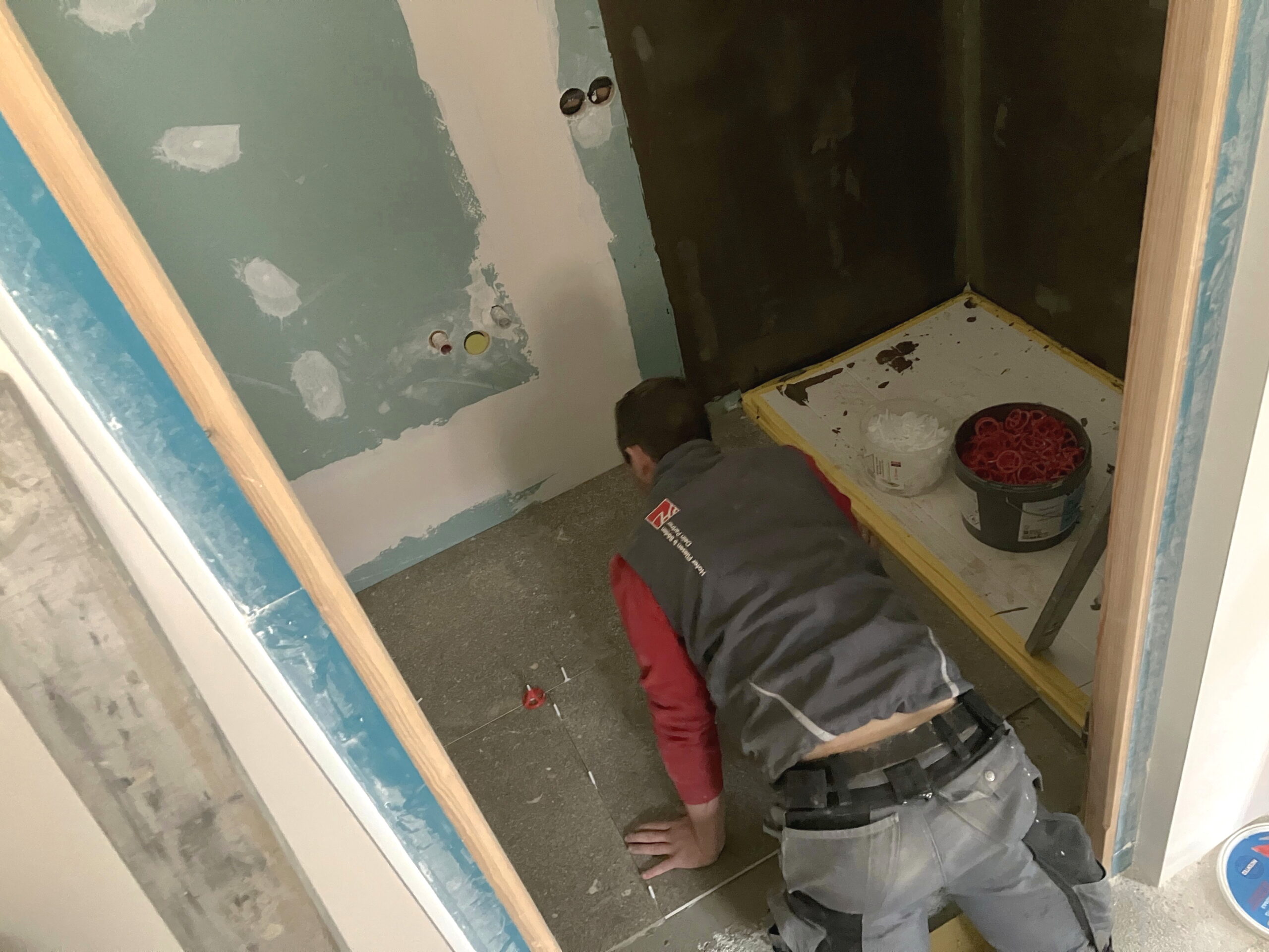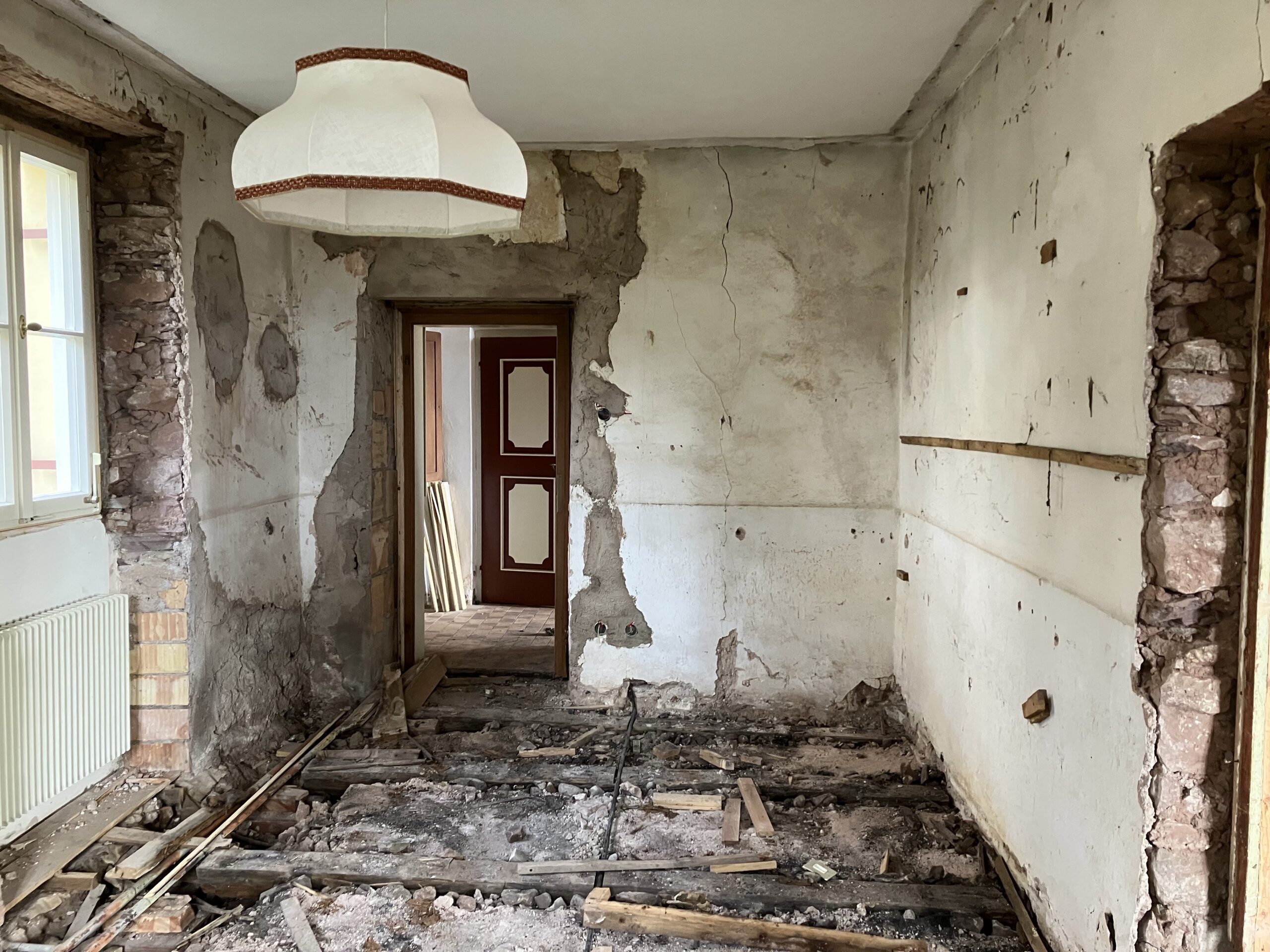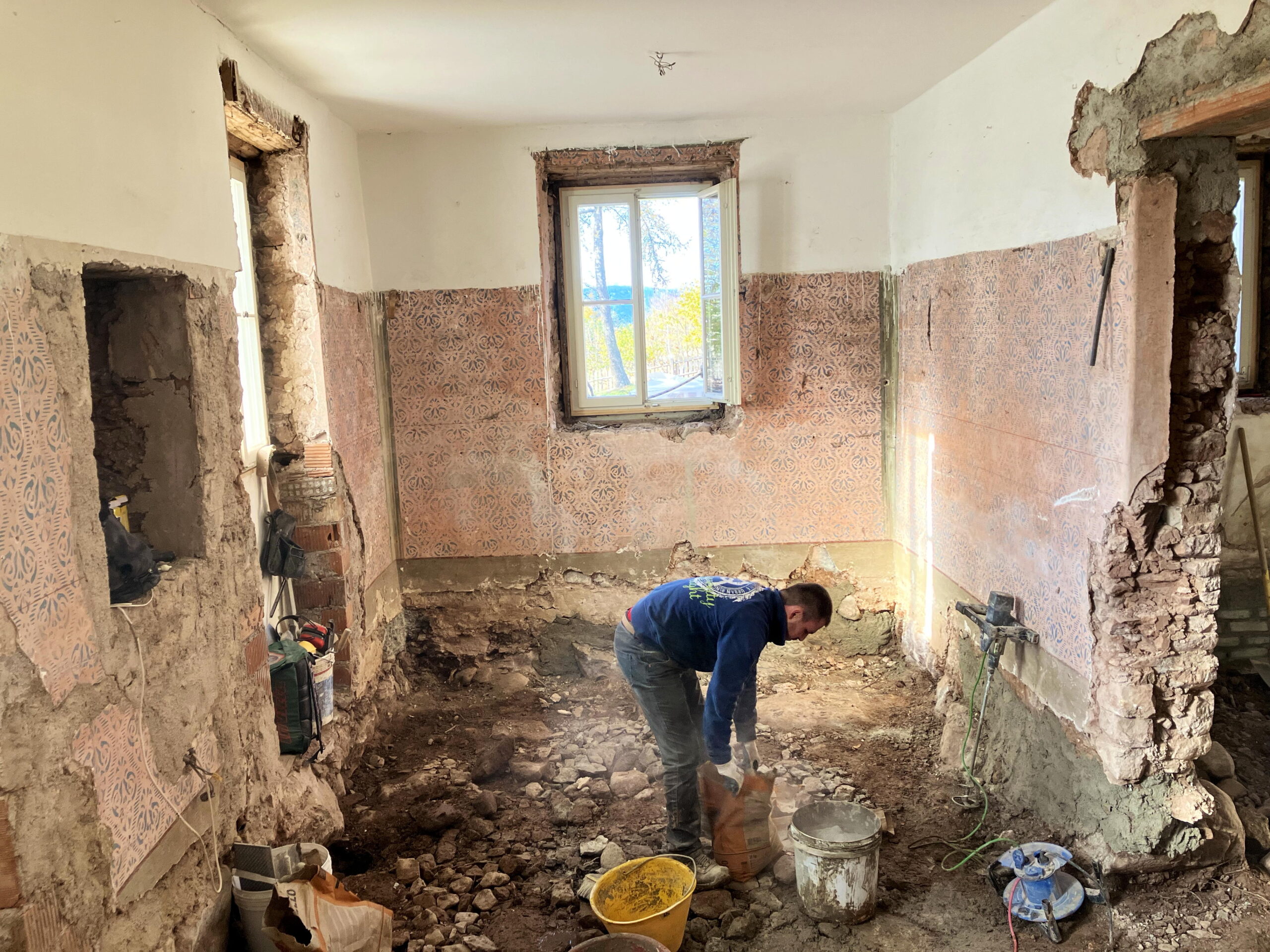 Verlegung Sandsteinplatten innen, neue Holzböden und Fließen