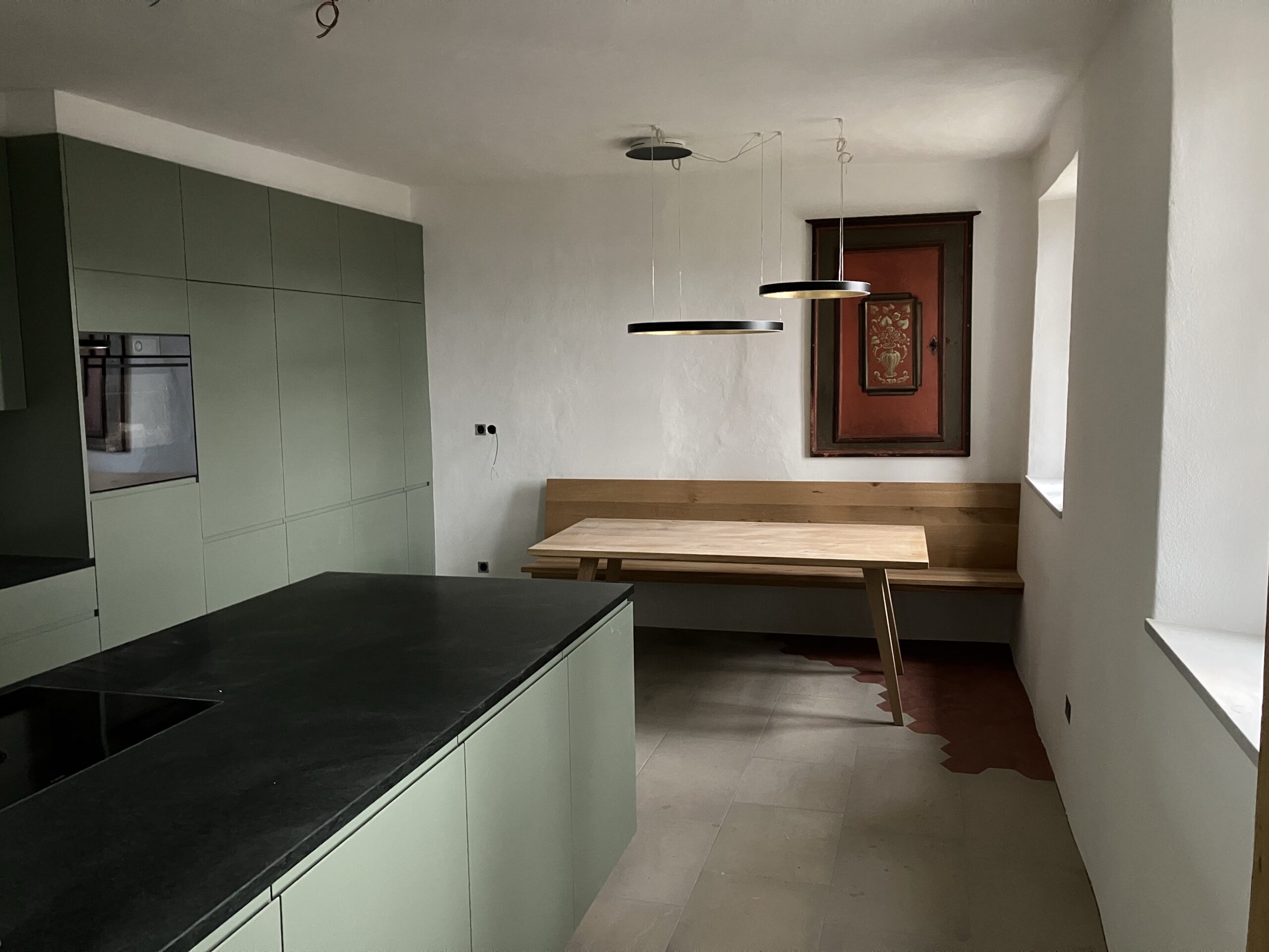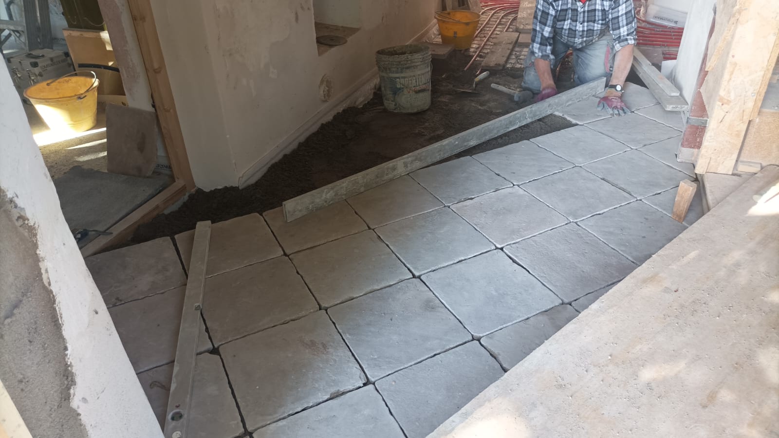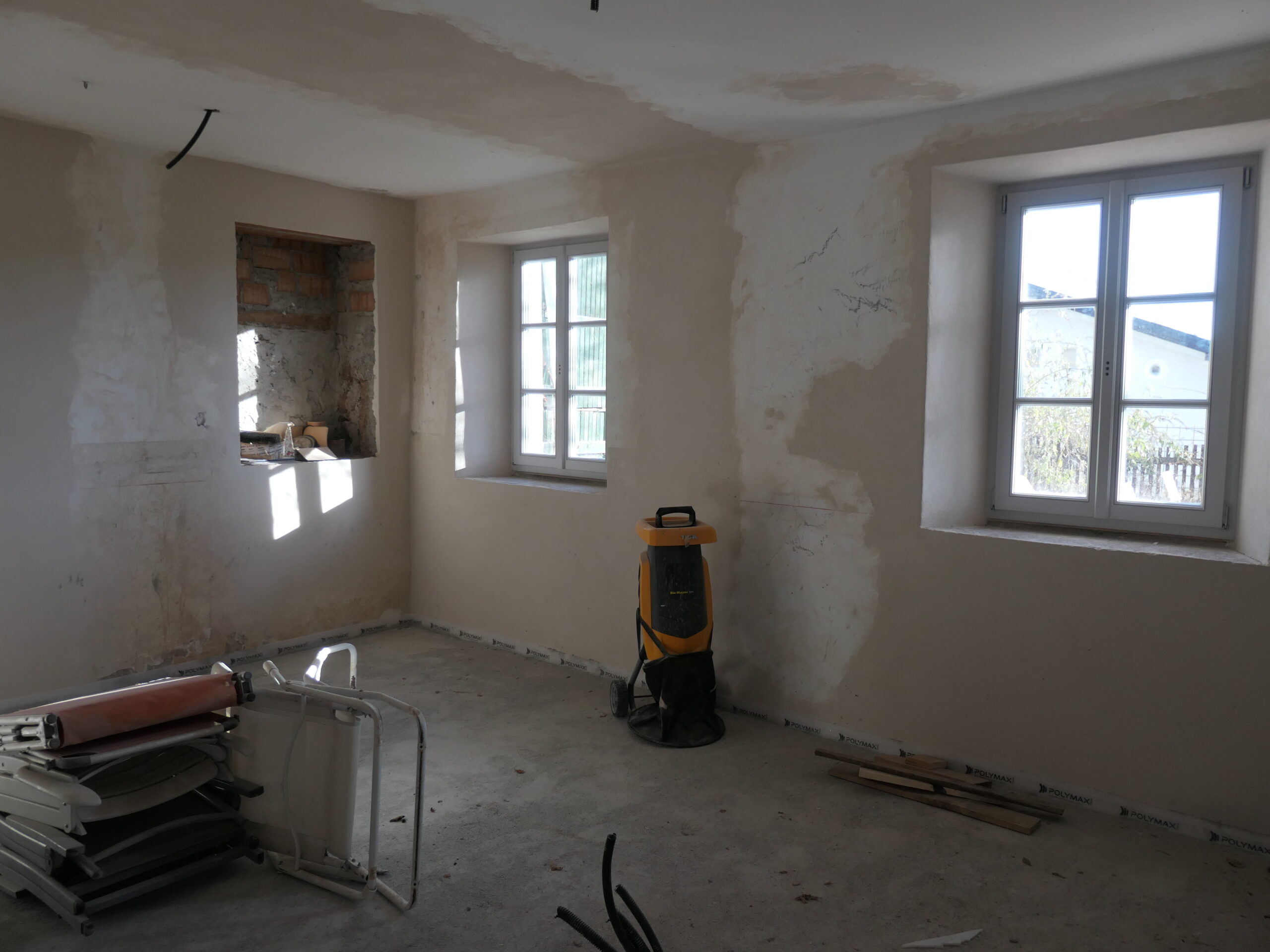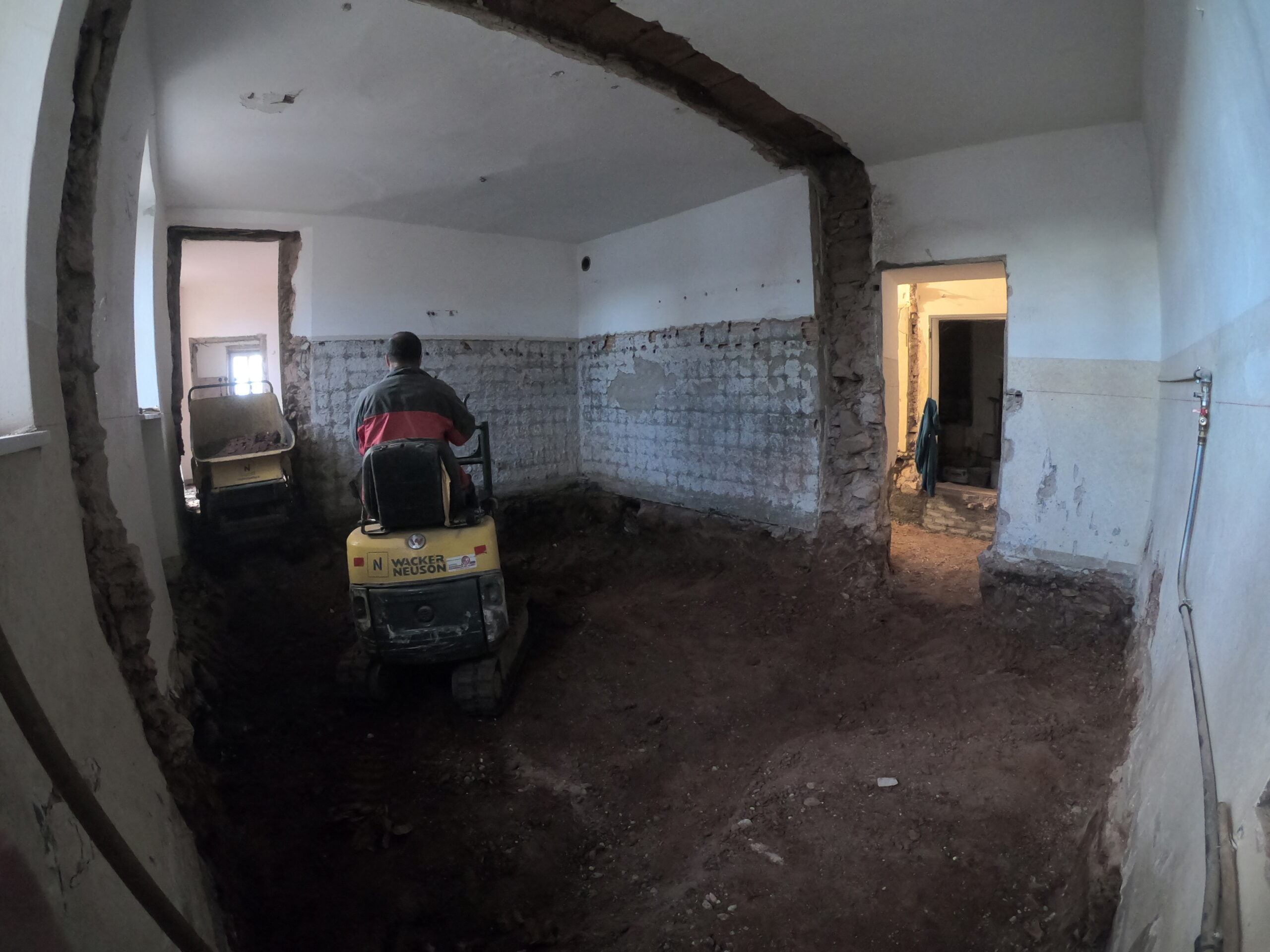Verlegung Sandsteinplatten innen, neue Holzböden und Fließen