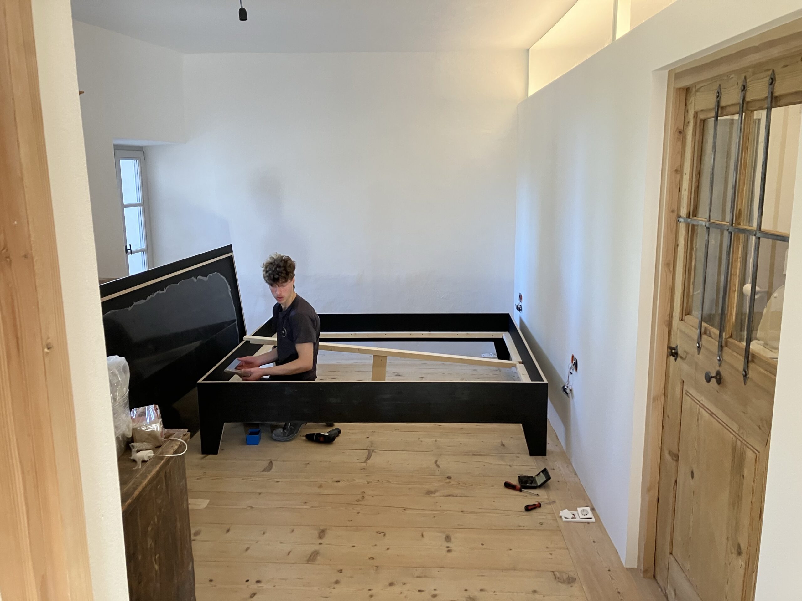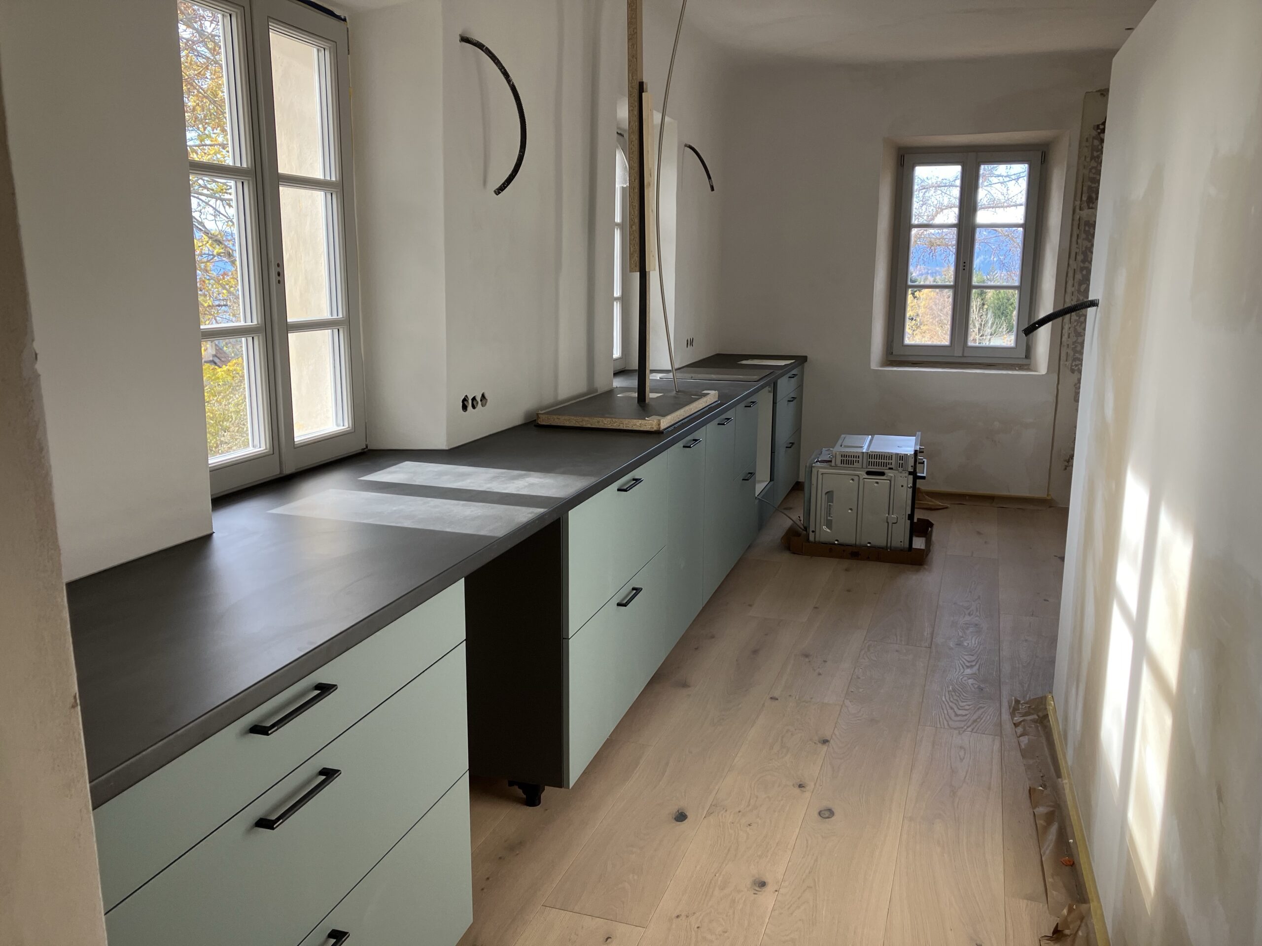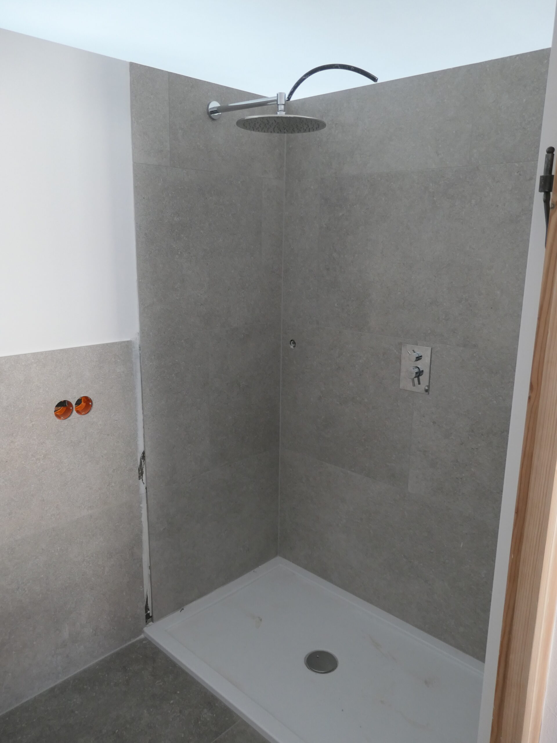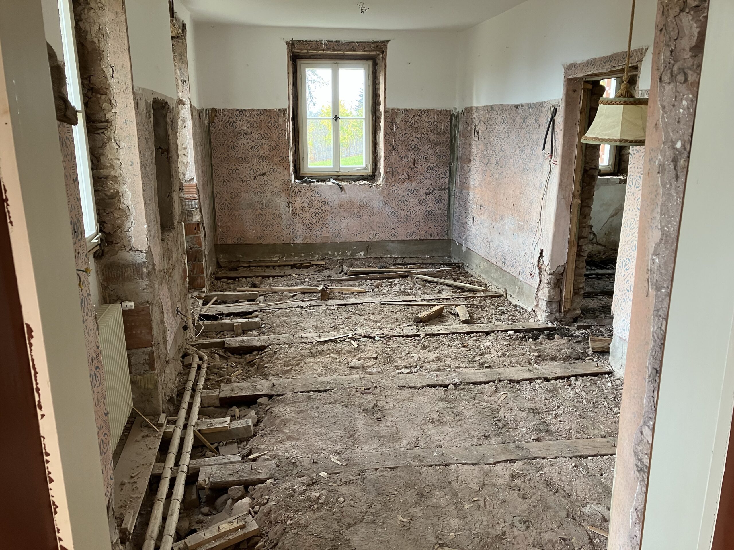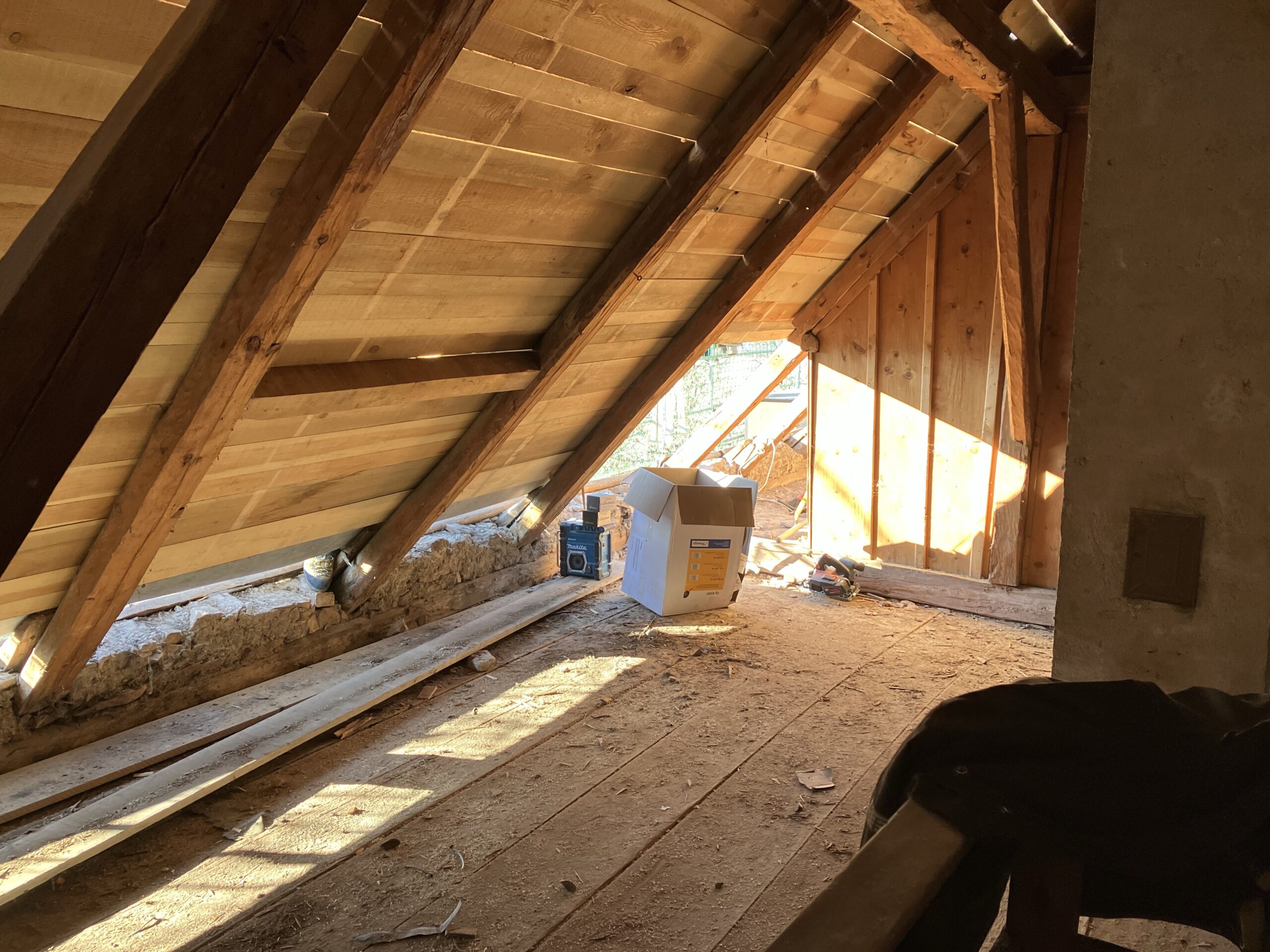 Verlegung Sandsteinplatten innen, neue Holzböden und Fließen