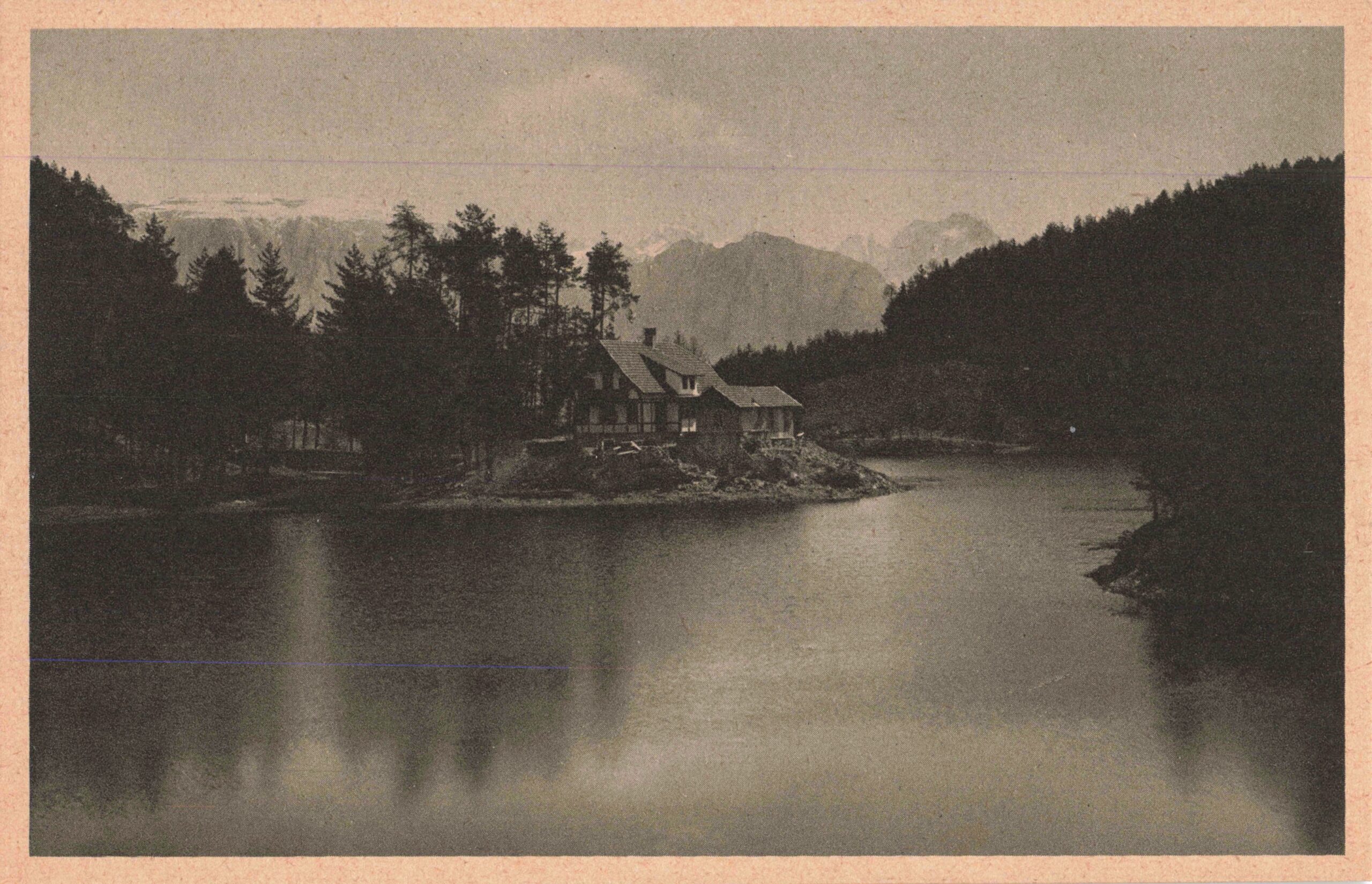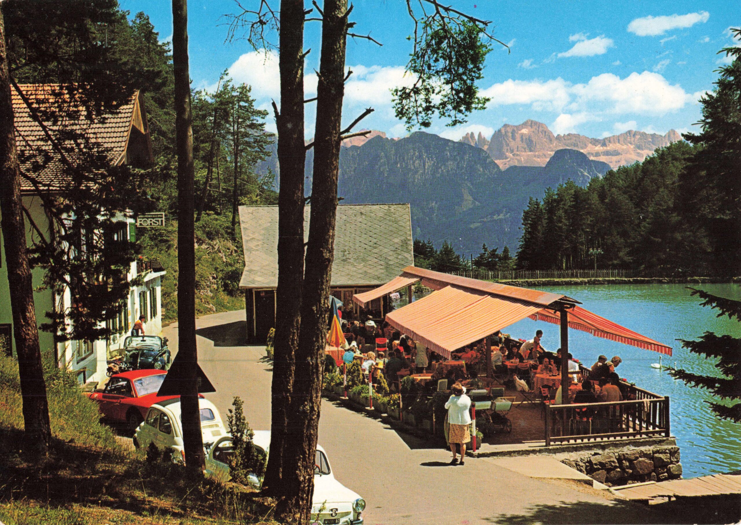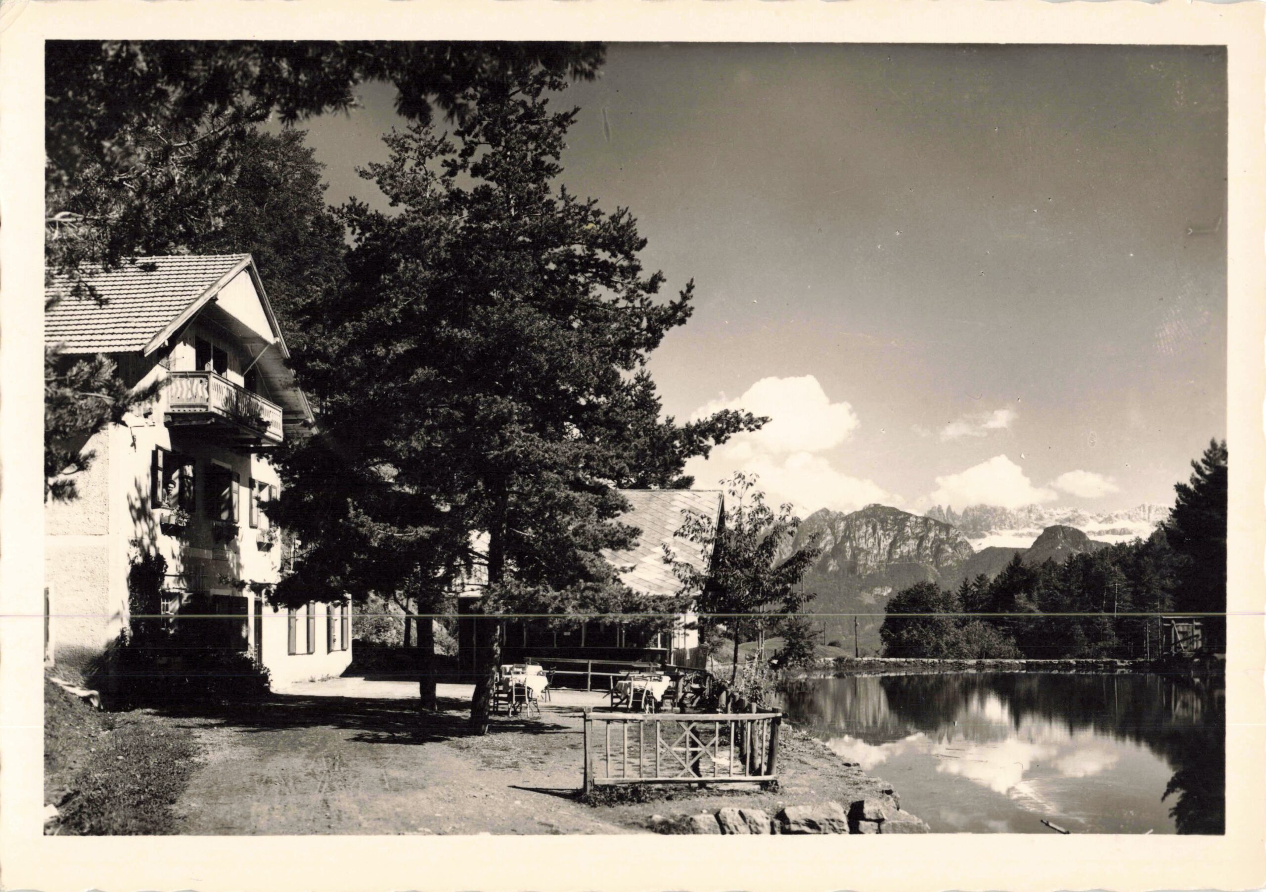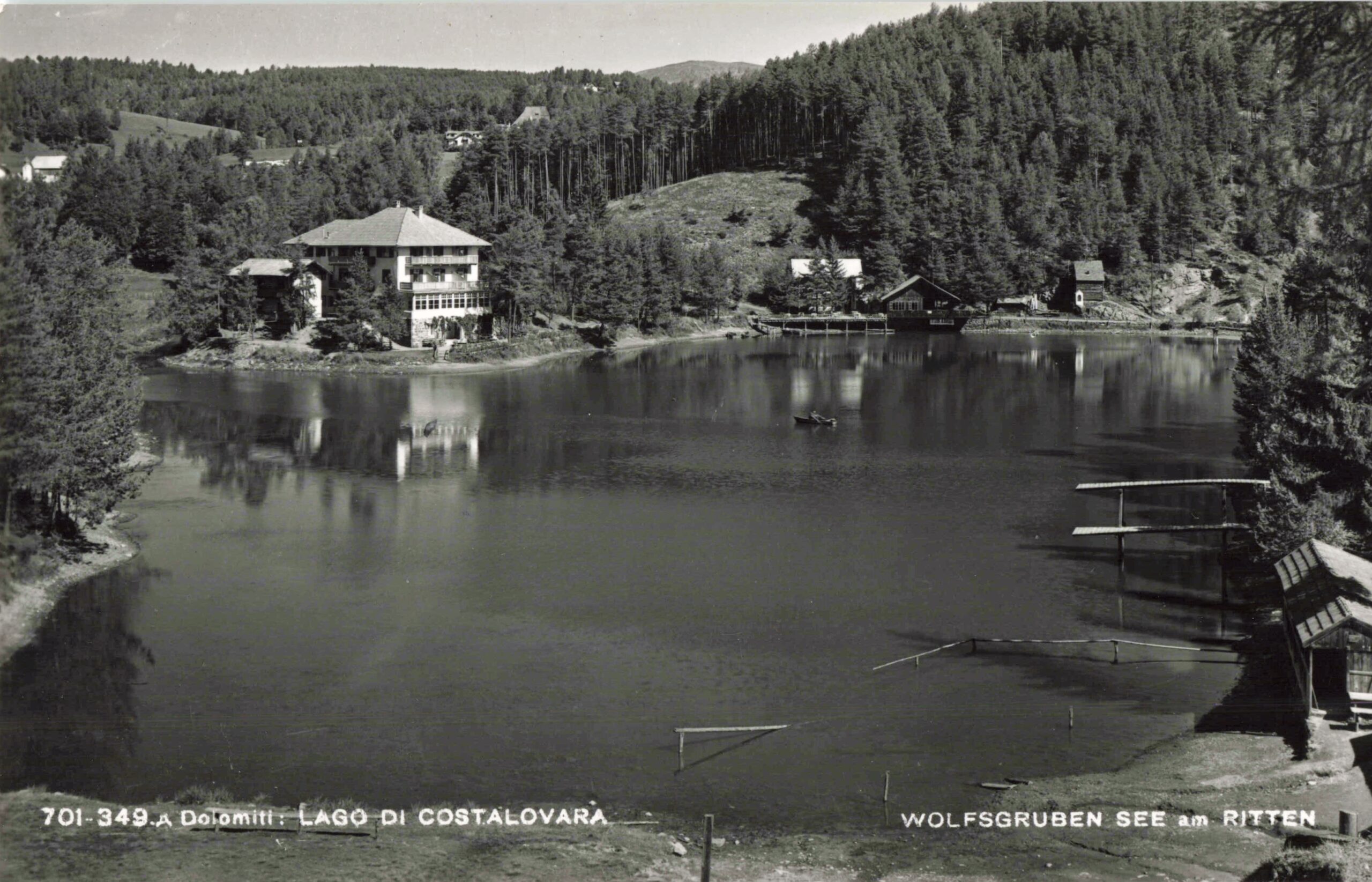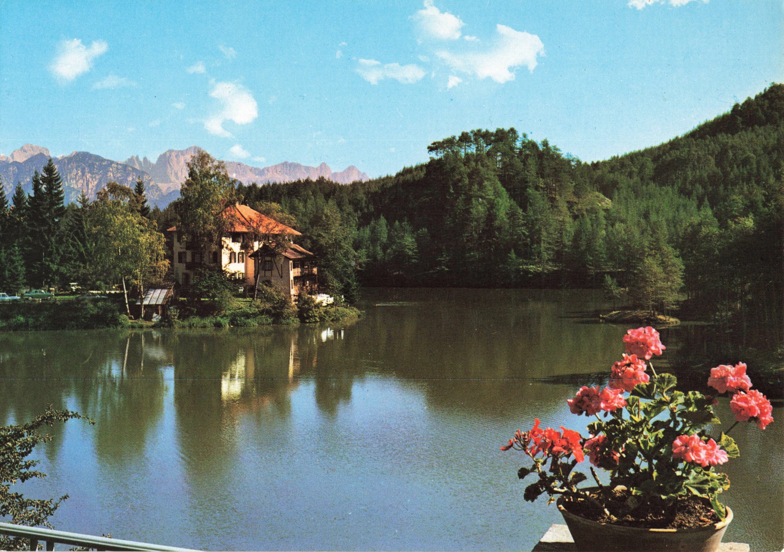 LAGO DI COSTALOVARA m. 1206 verso il Catinaccio m. 2981 – Renon pr. Bolzano WOLFSGRUBEN SEE gegen Rosengarten Ritten bei Bozen