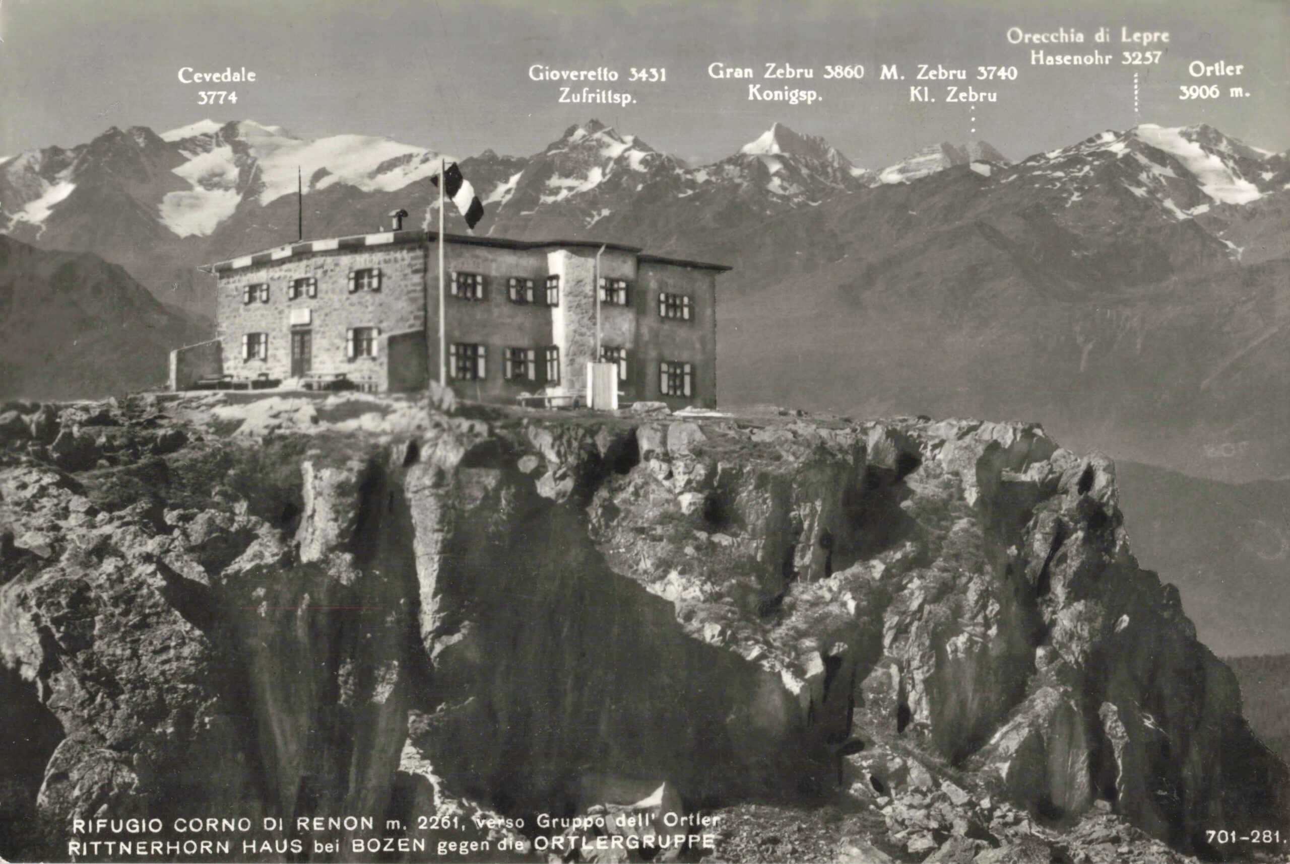RIFUGIO CORNO DI RENON m. 2261, verso Gruppo dell’Ortler RITTNERHORN HAUS bei Bozen gegen die ORTLERGRUPPE