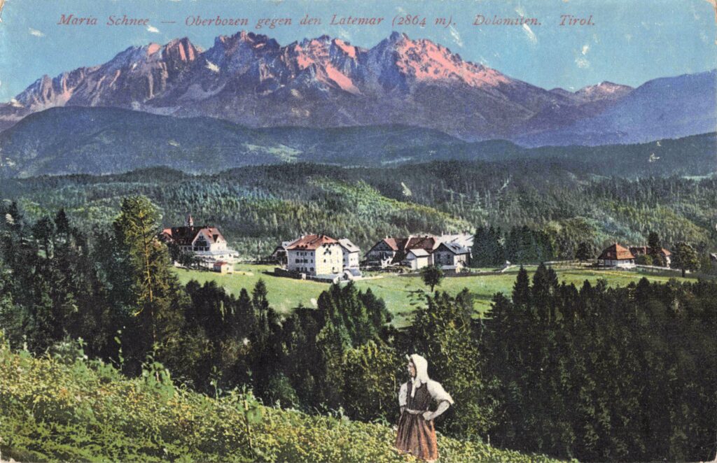 Abb. 1: „Maria Schnee – Oberbozen gegen den Latemar (2864 m). Dolomiten. Tirol“ (Kolorierte Ansichtskarte, Anfang 20. Jahrhundert).